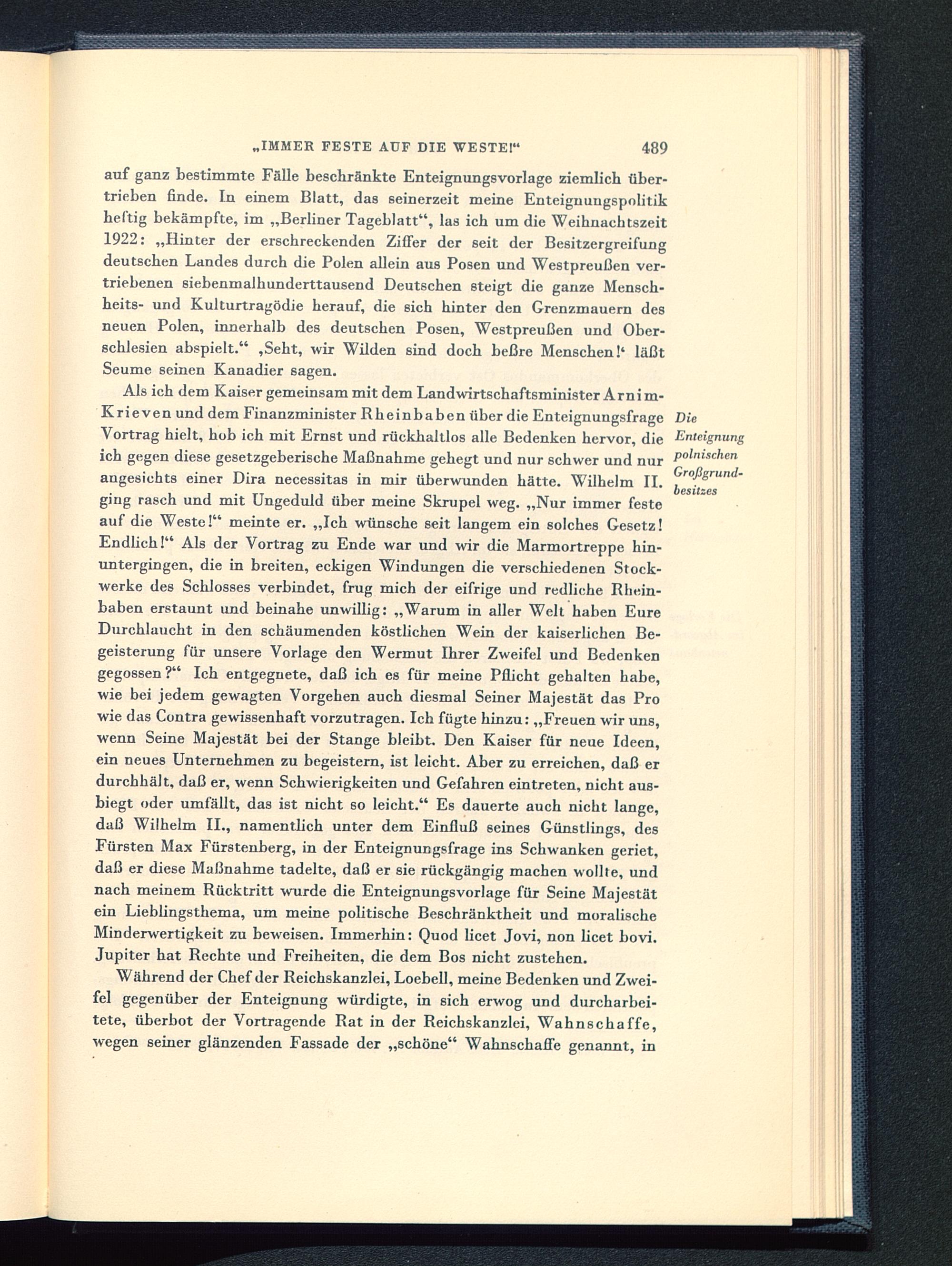 Als ich dem Kaiser gemeinsam mit dem Landwirtschaftsminister Arnim-Krieven und dem Finanzminister Rheinbaben über die Enteignungsfrage DieVortrag hielt, hob ich mit Ernst und rückhaltlos alle Bedenken hervor, die Enteignungich gegen diese gesetzgeberische Maßnahme gehegt und nur schwer und nur P°'" lse ' lerl
