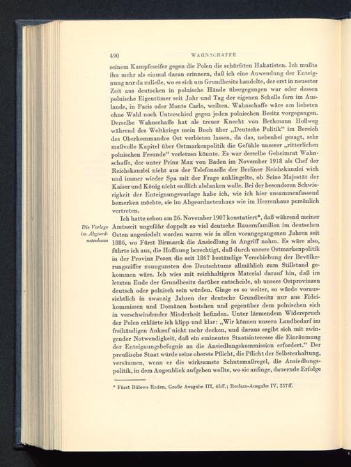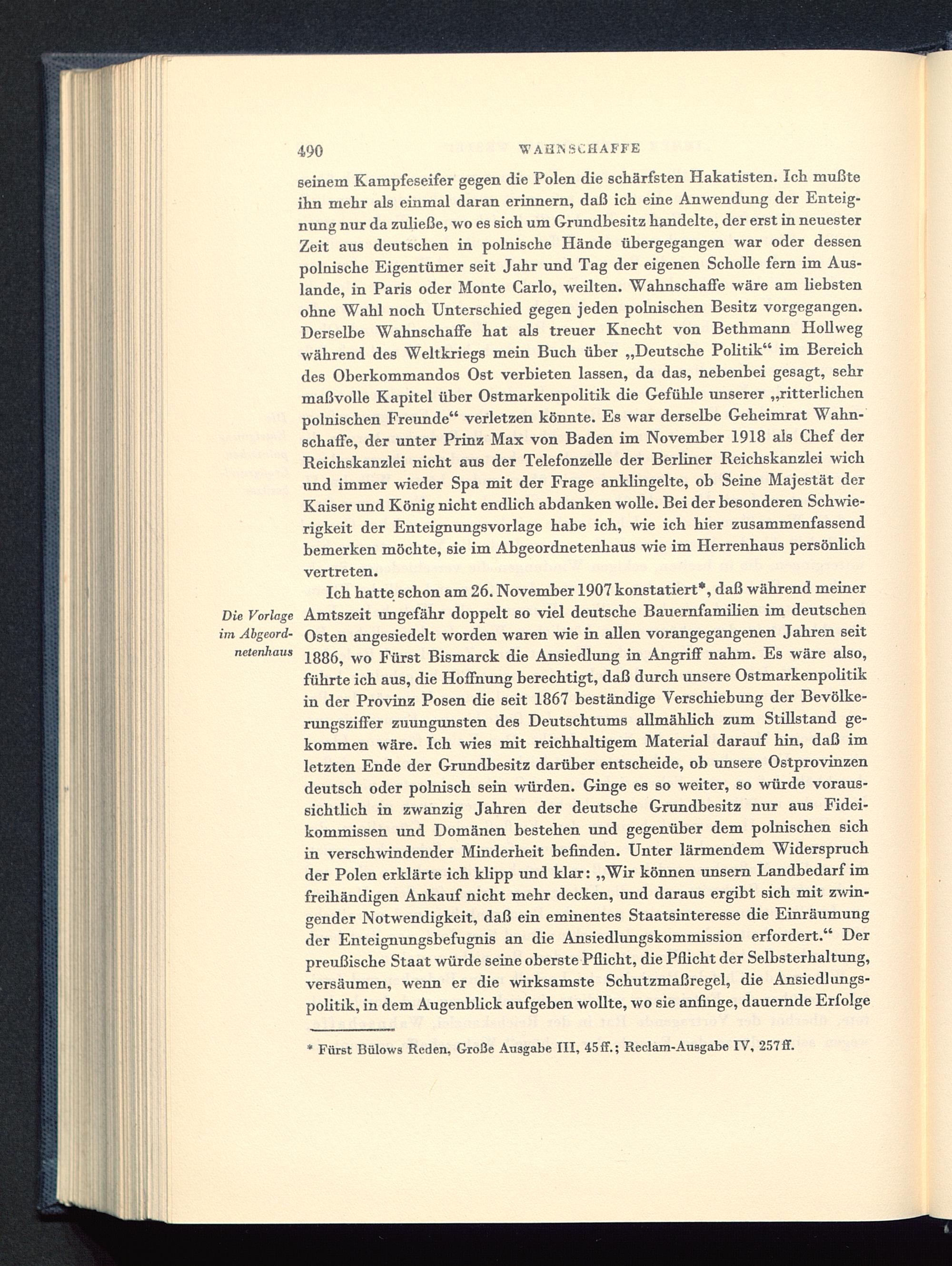 seinem Kampfeseifer gegen die Polen die schärfsten Hakatisten. Ich mußteihn mehr als einmal daran erinnern, daß ich eine Anwendung der Enteig-nung nur da zuließe, wo es sich um Grimdbesitz handelte, der erst in neuesterZeit aus deutschen in polnische Hände übergegangen war oder dessenpolnische Eigentümer seit Jahr und Tag der eigenen Scholle fern im Aus-lande, in Paris oder Monte Carlo, weilten. Wahnschaffe wäre am liebstenohne Wahl noch Unterschied gegen jeden polnischen Besitz vorgegangen.Derselbe Wahnschaffe hat als treuer Knecht von Bethmann Hollwegwährend des Weltkriegs mein Buch über „Deutsche Politik" im Bereichdes Oberkommandos Ost verbieten lassen, da das, nebenbei gesagt, sehrmaßvolle Kapitel über Ostmarkenpobtik die Gefühle unserer „ritterlichenpolnischen Freunde" verletzen könnte. Es war derselbe Geheimrat Wahn-schaffe, der unter Prinz Max von Baden im November 1918 als Chef derReichskanzlei nicht aus der Telefonzelle der Berliner Reichskanzlei wichund immer wieder Spa mit der Frage anklingelte, ob Seine Majestät derKaiser und König nicht endbch abdanken wolle. Bei der besonderen Schwie-rigkeit der Enteignungsvorlage habe ich, wie ich hier zusammenfassendbemerken möchte, sie im Abgeordnetenhaus wie im Herrenhaus persönlichvertreten.