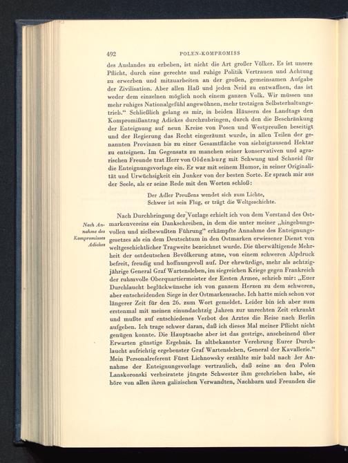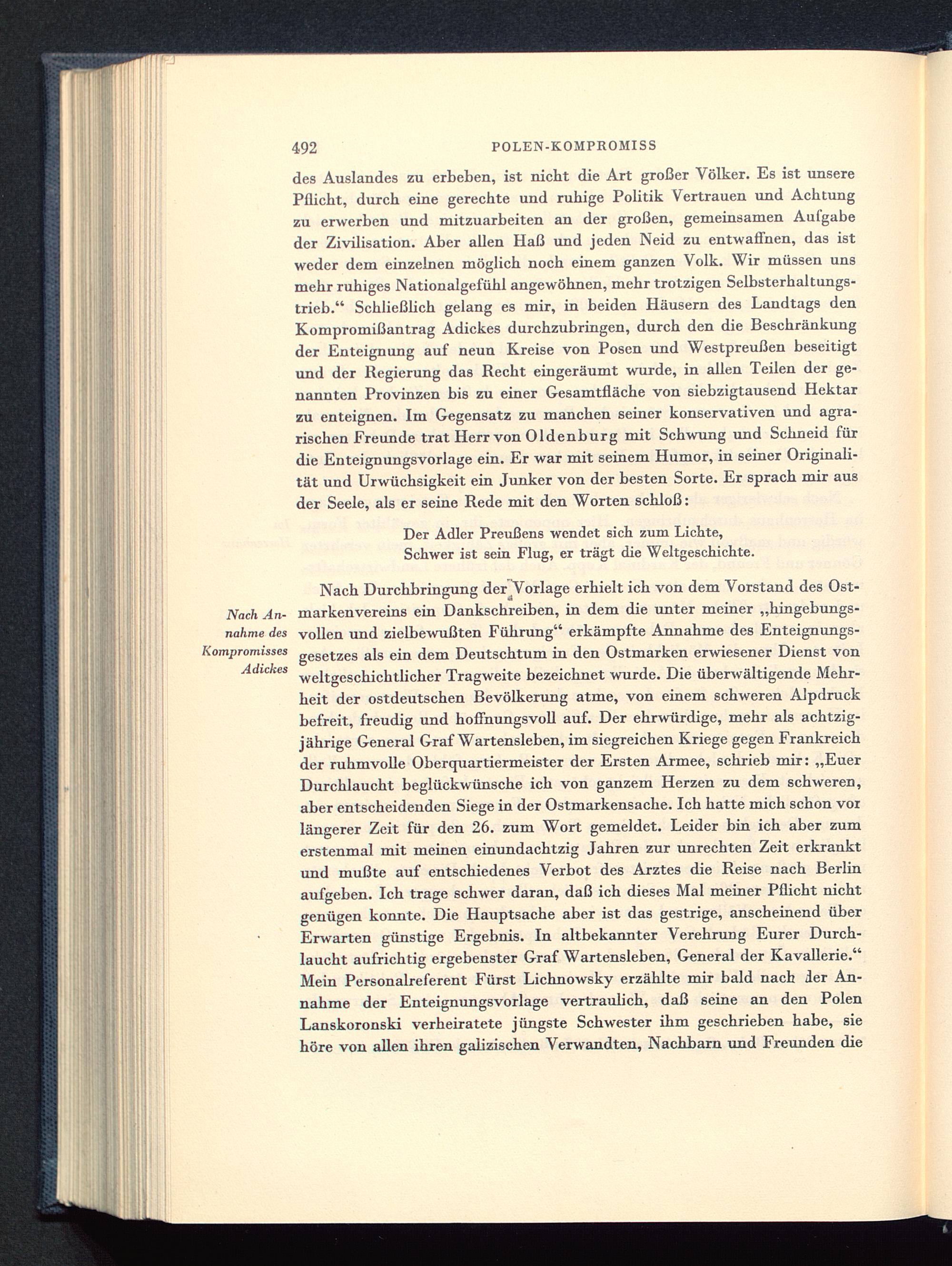 des Auslandes zu erbeben, ist nicbt die Art großer Völker. Es ist unserePflicbt, durch eine gerechte und ruhige Politik Vertrauen und Achtungzu erwerben und mitzuarbeiten an der großen, gemeinsamen Aufgabeder Zivilisation. Aber allen Haß und jeden Neid zu entwaffnen, das istweder dem einzelnen möglich noch einem ganzen Volk. Wir müssen unsmehr ruhiges Nationalgefühl angewöhnen, mehr trotzigen Selbsterhaltungs-trieb." Schließlich gelang es mir, in beiden Häusern des Landtags denKompromißantrag Adickes durchzubringen, durch den die Beschränkungder Enteignung auf neun Kreise von Posen und Westpreußen beseitigtund der Regierung das Recht eingeräumt wurde, in allen Teilen der ge-nannten Provinzen bis zu einer Gesamtfläche von siebzigtausend Hektarzu enteignen. Im Gegensatz zu manchen seiner konservativen und agra-rischen Freunde trat Herr von Oldenburg mit Schwung und Schneid fürdie Enteignungsvorlage ein. Er war mit seinem Humor, in seiner Originali-tät und Urwüchsigkeit ein Junker von der besten Sorte. Er sprach mir ausder Seele, als er seine Rede mit den Worten schloß: