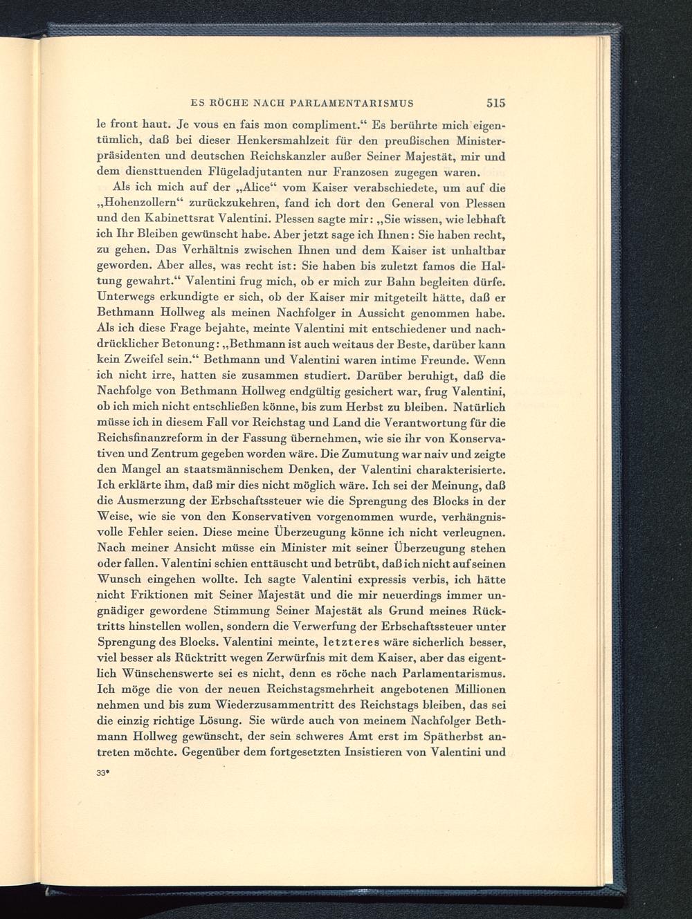 le front haut. Je vous en fais mon compliment." Es berührte mich'eigen-tümlich, daß bei dieser Henkersmahlzeit für den preußischen Minister-präsidenten und deutschen Reichskanzler außer Seiner Majestät, mir unddem diensttuenden Flügeladjutanten nur Franzosen zugegen waren.