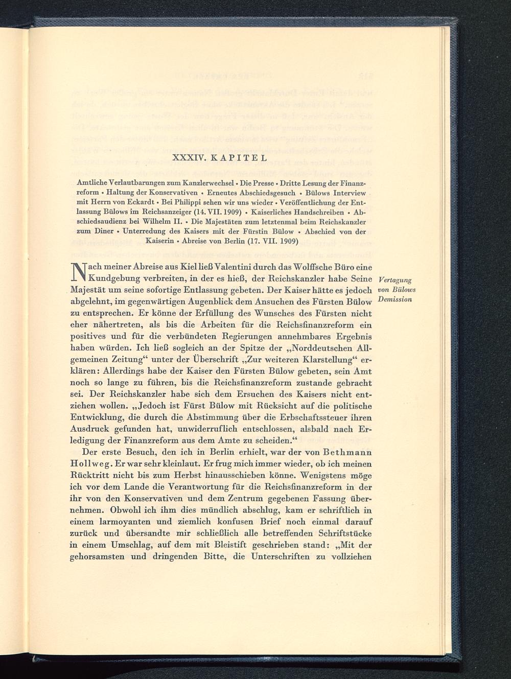Amtliche Verlautbarungen zum Kanzlerwechsel • Die Presse • Dritte Lesung der Finanz-reform • Haltung der Konservativen • Erneutes Abschiedsgesuch • Bülows Interviewmit Herrn von Eckardt • Bei Philippi sehen wir uns wieder • Veröffentlichung der Ent-lassung Bülows im Reichsanzeiger (14. VII. 1909) • Kaiserliches Handschreiben • Ab-schiedsaudienz bei Wilhelm II. • Die Majestäten zum letztenmal beim Reichskanzlerzum Diner • Unterredung des Kaisers mit der Fürstin Bülow • Abschied von derKaiserin . Abreise von Berlin (17. VII. 1909)