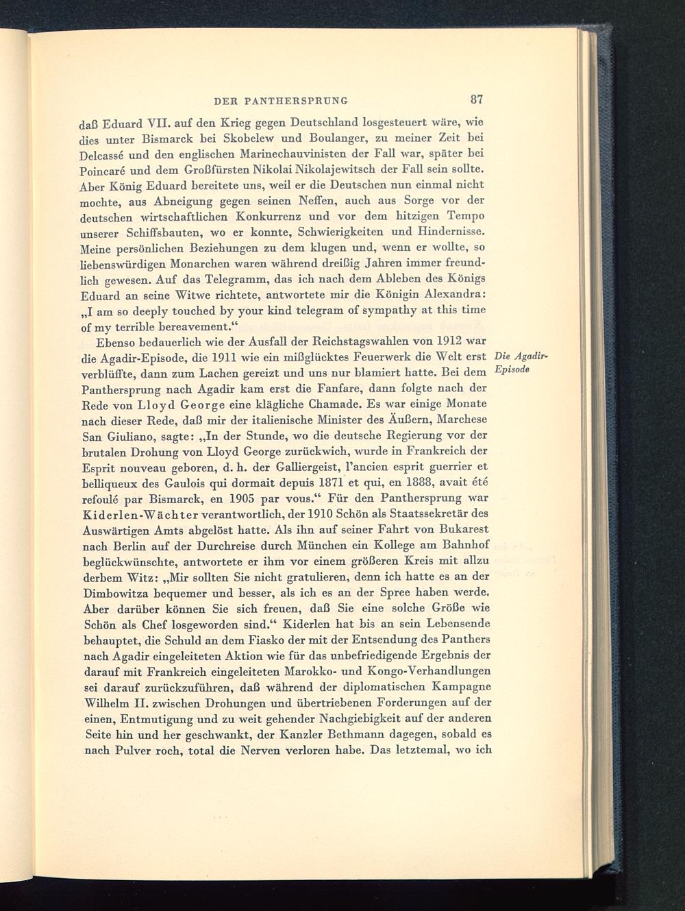 Ebenso bedauerlich wie der Ausfall der Reichstagswahlen von 1912 wardie Agadir-Episode, die 1911 wie ein mißglücktes Feuerwerk die Welt erst Die Agadir -verblüffte, dann zum Lachen gereizt und uns nur blamiert hatte. Bei dem EpisodePanthersprung nach Agadir kam erst die Fanfare, dann folgte nach derRede von Lloyd George eine klägliche Chamade. Es war einige Monatenach dieser Rede, daß mir der italienische Minister des Äußern, MarcheseSan Giuliano, sagte: „In der Stunde, wo die deutsche Regierung vor derbrutalen Drohung von Lloyd George zurückwich, wurde in Frankreich derEsprit nouveau geboren, d. h. der Galliergeist, l'ancien esprit guerrier etbelliqueux des Gaulois qui dormait depuis 1871 et qui, en 1888, avait eterefoule par Bismarck , en 1905 par vous." Für den Panthersprung warKiderlen-Wächter verantwortlich, der 1910 Schön als Staatssekretär desAuswärtigen Amts abgelöst hatte. Als ihn auf seiner Fahrt von Bukarest nach Berlin auf der Durchreise durch München ein Kollege am Bahnhofbeglückwünschte, antwortete er ihm vor einem größeren Kreis mit allzuderbem Witz: „Mir sollten Sie nicht gratulieren, denn ich hatte es an derDimbowitza bequemer und besser, als ich es an der Spree haben werde.Aber darüber können Sie sich freuen, daß Sie eine solche Größe wieSchön als Chef losgeworden sind." Kiderlen hat bis an sein Lebensendebehauptet, die Schuld an dem Fiasko der mit der Entsendung des Panthersnach Agadir eingeleiteten Aktion wie für das unbefriedigende Ergebnis derdarauf mit Frankreich eingeleiteten Marokko- und Kongo -Verhandlungensei darauf zurückzuführen, daß während der diplomatischen KampagneWilhelm II. zwischen Drohungen und übertriebenen Forderungen auf dereinen, Entmutigung und zu weit gehender Nachgiebigkeit auf der anderenSeite hin und her geschwankt, der Kanzler Bethmann dagegen, sobald esnach Pulver roch, total die Nerven verloren habe. Das letztemal, wo ich