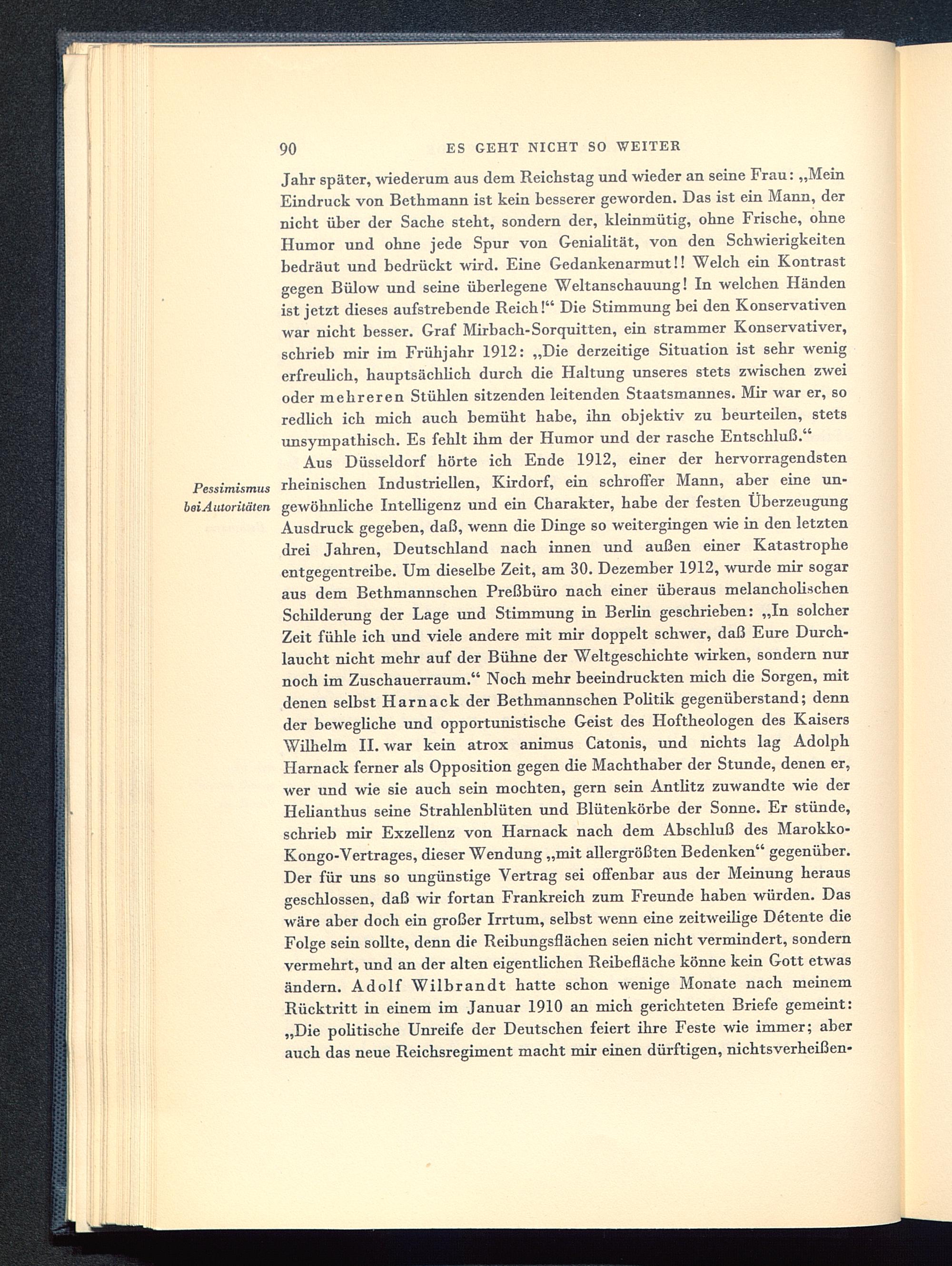 Jahr später, wiederum aus dem Reichstag und wieder an seine Frau: „MeinEindruck von Bethmann ist kein besserer geworden. Das ist ein Mann, dernicht über der Sache steht, sondern der, kleinmütig, ohne Frische, ohneHumor und ohne jede Spur von Genialität, von den Schwierigkeitenbedräut und bedrückt wird. Eine Gedankenarmut!! Welch ein Kontrastgegen Bülow und seine überlegene Weltanschauung! In welchen Händenist jetzt dieses aufstrebende Reich!" Die Stimmung bei den Konservativenwar nicht besser. Graf Mirbach-Sorquitten, ein strammer Konservativer,schrieb mir im Frühjahr 1912: „Die derzeitige Situation ist sehr wenigerfreulich, hauptsächlich durch die Haltung unseres stets zwischen zweioder mehreren Stühlen sitzenden leitenden Staatsmannes. Mir war er, soredlich ich mich auch bemüht habe, ihn objektiv zu beurteilen, stetsunsympathisch. Es fehlt ihm der Humor und der rasche Entschluß."Aus Düsseldorf hörte ich Ende 1912, einer der hervorragendstenPessimismus rheinischen Industriellen, Kirdorf , ein schroffer Mann, aber eine un-beiAutoritäten gewöhnliche Intelligenz und ein Charakter, habe der festen UberzeugungAusdruck gegeben, daß, wenn die Dinge so weitergingen wie in den letztendrei Jahren, Deutschland nach innen und außen einer Katastropheentgegentreibe. Um dieselbe Zeit, am 30. Dezember 1912, wurde mir sogaraus dem Bethmannschen Preßbüro nach einer überaus melancholischenSchilderung der Lage und Stimmung in Berlin geschrieben: „In solcherZeit fühle ich und viele andere mit mir doppelt schwer, daß Eure Durch-laucht nicht mehr auf der Bühne der Weltgeschichte wirken, sondern nurnoch im Zuschauerraum." Noch mehr beeindruckten mich die Sorgen, mitdenen selbst Harnack der Bethmannschen Politik gegenüberstand; dennder bewegliche und opportunistische Geist des Hoftheologen des KaisersWilhelm II. war kein atrox animus Catonis, und nichts lag AdolphHarnack ferner als Opposition gegen die Machthaber der Stunde, denen er,wer und wie sie auch sein mochten, gern sein Antlitz zuwandte wie derHelianthus seine Strahlenblüten und Blütenkörbe der Sonne. Er stünde,schrieb mir Exzellenz von Harnack nach dem Abschluß des Marokko-Kongo-Vertrages, dieser Wendung „mit allergrößten Bedenken" gegenüber.Der für uns so ungünstige Vertrag sei offenbar aus der Meinung herausgeschlossen, daß wir fortan Frankreich zum Freunde haben würden. Daswäre aber doch ein großer Irrtum, selbst wenn eine zeitweilige Detente dieFolge sein sollte, denn die Reibungsflächen seien nicht vermindert, sondernvermehrt, und an der alten eigentlichen Reibefläche könne kein Gott etwasändern. Adolf Wilbrandt hatte schon wenige Monate nach meinemRücktritt in einem im Januar 1910 an mich gerichteten Briefe gemeint:„Die politische Unreife der Deutschen feiert ihre Feste wie immer; aberauch das neue Reichsregiment macht mir einen dürftigen, nichtsverheißen-