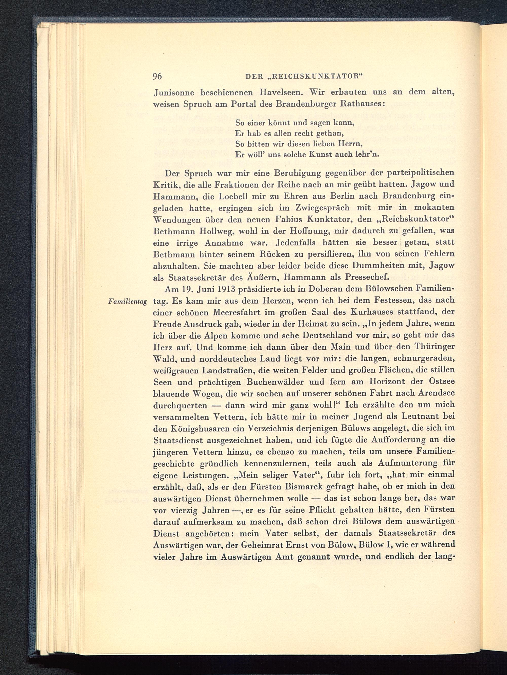 Der Spruch war mir eine Beruhigung gegenüber der parteipolitischenKritik, die alle Fraktionen der Reihe nach an mir geübt hatten. Jagow undHammann, die Loebell mir zu Ehren aus Berlin nach Brandenburg ein-geladen hatte, ergingen sich im Zwiegespräch mit mir in mokantenWendungen über den neuen Fabius Kunktator , den „Reichskunktator"Bethmann Hollweg, wohl in der Hoffnung, mir dadurch zu gefallen, waseine irrige Annahme war. Jedenfalls hätten sie besser getan, stattBethmann hinter seinem Rücken zu persiflieren, ihn von seinen Fehlernabzuhalten. Sie machten aber leider beide diese Dummheiten mit, Jagowals Staatssekretär des Äußern, Hammann als Pressechef.