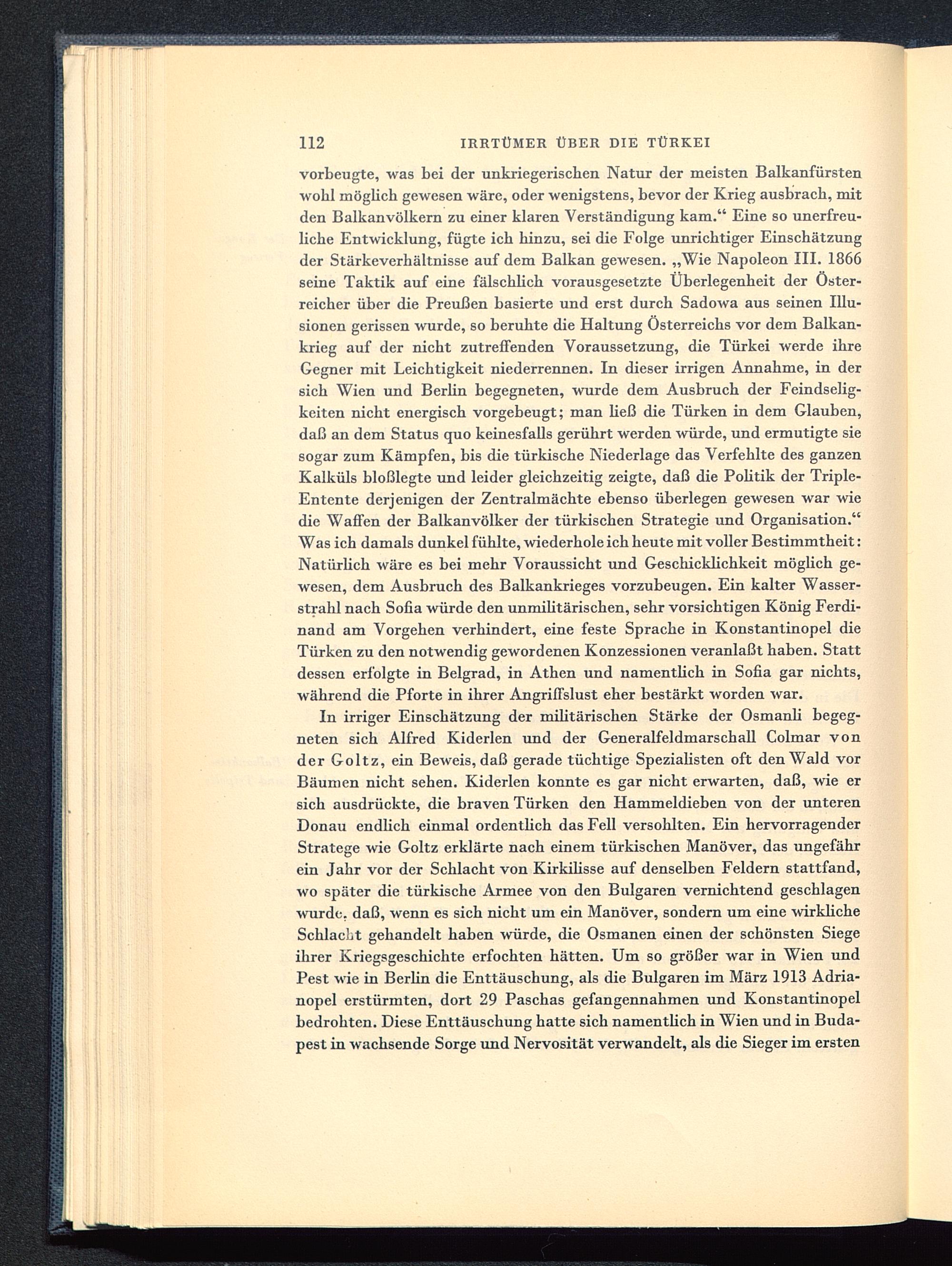 In irriger Einschätzung der militärischen Stärke der Osmanli begeg-neten sich Alfred Kiderlen und der Generalfeldmarschall Colmar vonder Goltz , ein Beweis, daß gerade tüchtige Spezialisten oft den Wald vorBäumen nicht sehen. Kiderlen konnte es gar nicht erwarten, daß, wie ersich ausdrückte, die braven Türken den Hammeldieben von der unterenDonau endlich einmal ordentlich das Fell versohlten. Ein hervorragenderStratege wie Goltz erklärte nach einem türkischen Manöver, das ungefährein Jahr vor der Schlacht von Kirkilisse auf denselben Feldern stattfand,wo später die türkische Armee von den Bulgaren vernichtend geschlagenwurde, daß, wenn es sich nicht um ein Manöver, sondern um eine wirklicheSchlacht gehandelt haben würde, die Osmanen einen der schönsten Siegeihrer Kriegsgeschichte erfochten hätten. Um so größer war in Wien undPest wie in Berlin die Enttäuschung, als die Bulgaren im März 1913 Adria-nopel erstürmten, dort 29 Paschas gefangennahmen und Konstantinopelbedrohten. Diese Enttäuschung hatte sich namentlich in Wien und in Buda-pest in wachsende Sorge und Nervosität verwandelt, als die Sieger im ersten