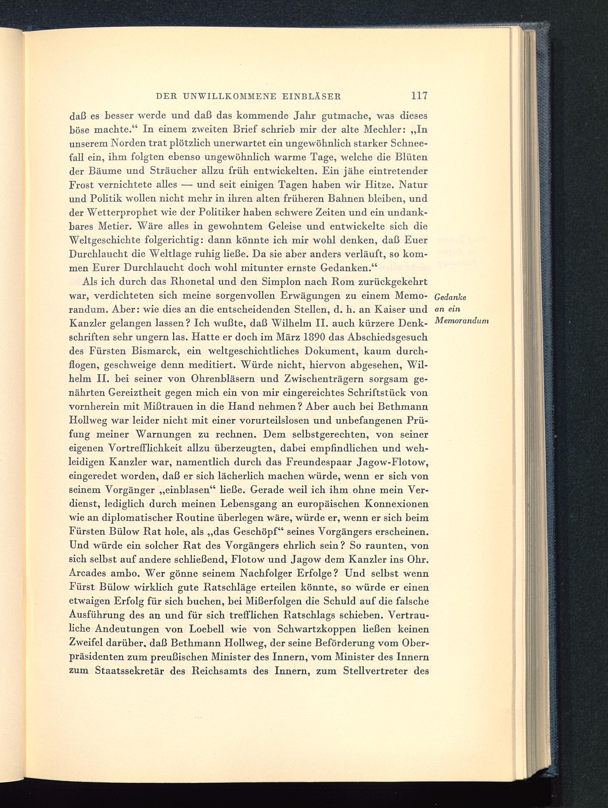 Als ich durch das Rhonetal und den Simplon nach Rom zurückgekehrtwar, verdichteten sich meine sorgenvollen Erwägungen zu einem Memo- Gedankerandum. Aber: wie dies an die entscheidenden Stellen, d. h. an Kaiser und an einKanzler gelangen lassen? Ich wußte, daß Wilhelm II. auch kürzere Denk- MemorandumSchriften sehr ungern las. Hatte er doch im März 1890 das Abschiedsgesuchdes Fürsten Bismarck, ein weltgeschichtliches Dokument, kaum durch-flogen, geschweige denn meditiert. Würde nicht, hiervon abgesehen, Wil-helm II. bei seiner von Ohrenbläsern und Zwischenträgern sorgsam ge-nährten Gereiztheit gegen mich ein von mir eingereichtes Schriftstück vonvornherein mit Mißtrauen in die Hand nehmen ? Aber auch bei BethmannHollweg war leider nicht mit einer vorurteilslosen und unbefangenen Prü-fung meiner Warnungen zu rechnen. Dem selbstgerechten, von seinereigenen Vortrefflichkeit allzu überzeugten, dabei empfindlichen und weh-leidigen Kanzler war, namentlich durch das Freundespaar Jagow-Flotow,eingeredet worden, daß er sich lächerlich machen würde, wenn er sich vonseinem Vorgänger „einblasen" üeße. Gerade weil ich ihm ohne mein Ver-dienst, lediglich durch meinen Lebensgang an europäischen Konnexionenwie an diplomatischer Routine überlegen wäre, würde er, wenn er sich beimFürsten Bülow Rat hole, als „das Geschöpf" seines Vorgängers erscheinen.Und würde ein solcher Rat des Vorgängers ehrlich sein? So raunten, vonsich selbst auf andere schließend, Flotow und Jagow dem Kanzler ins Ohr.Arcades ambo. Wer gönne seinem Nachfolger Erfolge? Und selbst wennFürst Bülow wirklich gute Ratschläge erteilen könnte, so würde er einenetwaigen Erfolg für sich buchen, bei Mißerfolgen die Schuld auf die falscheAusführung des an und für sich trefflichen Ratschlags schieben. Vertrau-liche Andeutungen von Loebell wie von Schwartzkoppen ließen keinenZweifel darüber, daß Bethmann Hollweg, der seine Beförderung vom Ober-präsidenten zum preußischen Minister des Innern, vom Minister des Innernzum Staatssekretär des Reichsamts des Innern, zum Stellvertreter des