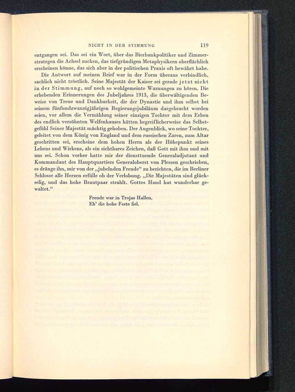 Die Antwort auf meinen Brief war in der Form überaus verbindlich,sachlich nicht tröstlich. Seine Majestät der Kaiser sei gerade jetzt nichtin der Stimmung, auf noch so wohlgemeinte Warnungen zu hören. Dieerhebenden Erinnerungen des Jubeljahres 1913, die überwältigenden Be-weise von Treue und Dankbarkeit, die der Dynastie und ihm selbst beiseinem fünfundzwanzigjährigen Regierungsjubiläum dargebracht wordenseien, vor allem die Vermählung seiner einzigen Tochter mit dem Erbendes endlich versöhnten Weifenhauses hätten begreiflicherweise das Selbst-gefühl Seiner Majestät mächtig gehoben. Der Augenblick, wo seine Tochter,geleitet von dem König von England und dem russischen Zaren, zum Altargeschritten sei, erscheine dem hohen Herrn als der Höhepunkt seinesLebens und Wirkens, als ein sichtbares Zeichen, daß Gott mit ihm und mituns sei. Schon vorher hatte mir der diensttuende Generaladjutant undKommandant des Hauptquartiers Generaloberst von Plessen geschrieben,es dränge ihn, mir von der „jubelnden Freude" zu berichten, die im BerlinerSchlosse alle Herzen erfülle ob der Verlobung. „Die Majestäten sind glück-selig, und das hohe Brautpaar strahlt. Gottes Hand hat wunderbar ge-waltet."