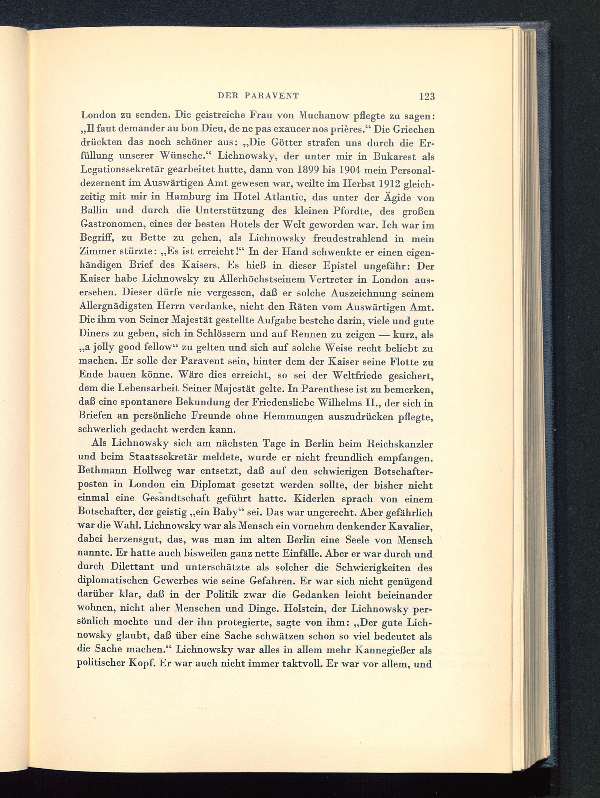 London zu senden. Die geistreiche Frau von Muchanow pflegte zu sagen:„II faut demander au bon Dieu, de ne pas exaucer nos prieres." Die Griechendrückten das noch schöner aus: „Die Götter strafen uns durch die Er-füllung unserer Wünsche." Lichnowsky, der unter mir in Bukarest alsLegationssekretär gearbeitet hatte, dann von 1899 bis 1904 mein Personal-dezernent im Auswärtigen Amt gewesen war, weilte im Herbst 1912 gleich-zeitig mit mir in Hamburg im Hotel Atlantic , das unter der Ägide vonBallin und durch die Unterstützung des kleinen Pfordte, des großenGastronomen, eines der besten Hotels der Welt geworden war. Ich war imBegriff, zu Bette zu gehen, als Lichnowsky freudestrahlend in meinZimmer stürzte: „Es ist erreicht!" In der Hand schwenkte er einen eigen-händigen Brief des Kaisers. Es hieß in dieser Epistel ungefähr: DerKaiser habe Lichnowsky zu Allerhöchstseinem Vertreter in London aus-ersehen. Dieser dürfe nie vergessen, daß er solche Auszeichnung seinemAllergnädigsten Herrn verdanke, nicht den Bäten vom Auswärtigen Amt .Die ihm von Seiner Majestät gestellte Aufgabe bestehe darin, viele und guteDiners zu geben, sich in Schlössern und auf Bennen zu zeigen — kurz, als„a jolly good fellow" zu gelten und sich auf solche Weise recht behebt zumachen. Er solle der Paravent sein, hinter dem der Kaiser seine Flotte zuEnde bauen könne. Wäre dies erreicht, so sei der Weltfriede gesichert,dem die Lebensarbeit Seiner Majestät gelte. In Parenthese ist zu bemerken,daß eine spontanere Bekundung der Friedenshebe Wilhelms IL, der sich inBriefen an persönliche Freunde ohne Hemmungen auszudrücken pflegte,schwerhch gedacht werden kann.