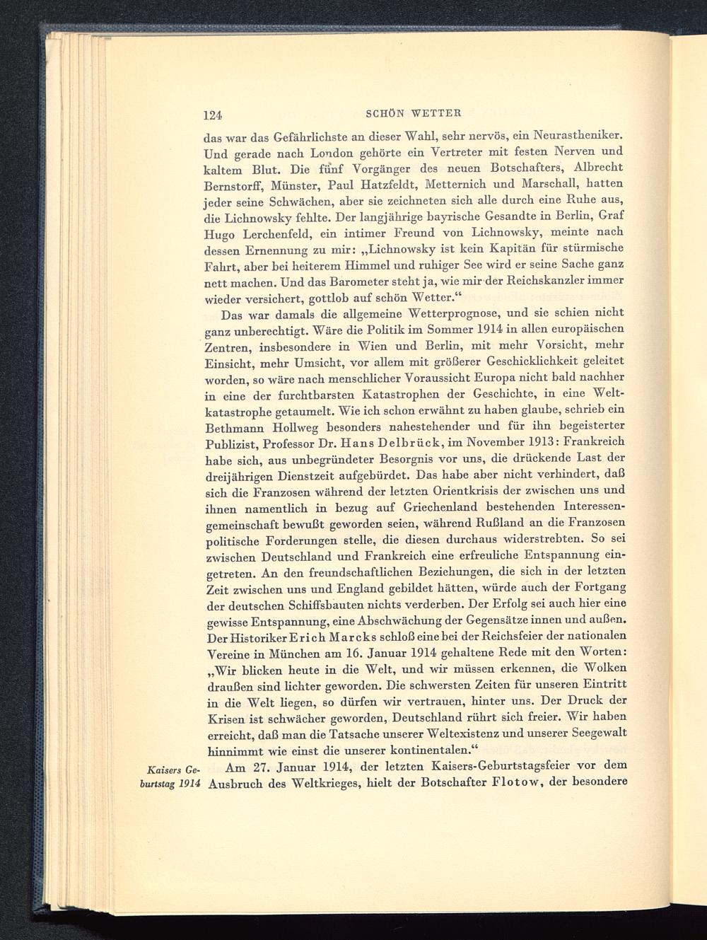 Das war damals die allgemeine Wetterprognose, und sie schien nichtganz unberechtigt. Wäre die Politik im Sommer 1914 in allen europäischenZentren, insbesondere in Wien und Berlin , mit mehr Vorsicht, mehrEinsicht, mehr Umsicht, vor allem mit größerer Geschicklichkeit geleitetworden, so wäre nach menschlicher Voraussicht Europa nicht bald nachherin eine der furchtbarsten Katastrophen der Geschichte, in eine Welt-katastrophe getaumelt. Wie ich schon erwähnt zu haben glaube, schrieb einBethmann Hollweg besonders nahestehender und für ihn begeisterterPublizist, Professor Dr. Hans Delbrück, im November 1913: Frankreich habe sich, aus unbegründeter Besorgnis vor uns, die drückende Last derdreijährigen Dienstzeit aufgebürdet. Das habe aber nicht verhindert, daßsich die Franzosen während der letzten Orientkrisis der zwischen uns undihnen namentlich in bezug auf Griechenland bestehenden Interessen-gemeinschaft bewußt geworden seien, während Rußland an die Franzosenpolitische Forderungen stelle, die diesen durchaus widerstrebten. So seizwischen Deutschland und Frankreich eine erfreuliche Entspannung ein-getreten. An den freundschaftlichen Beziehungen, die sich in der letztenZeit zwischen uns und England gebildet hätten, würde auch der Fortgangder deutschen SchhTsbauten nichts verderben. Der Erfolg sei auch hier einegewisse Entspannung, eine Abschwächung der Gegensätze innen und außen.Der Historiker Erich Mareks schloß eine bei der Reichsfeier der nationalenVereine in München am 16. Januar 1914 gehaltene Rede mit den Worten:„Wir bücken heute in die Welt, und wir müssen erkennen, die Wolkendraußen sind lichter geworden. Die schwersten Zeiten für unseren Eintrittin die Welt hegen, so dürfen wir vertrauen, hinter uns. Der Druck derKrisen ist schwächer geworden, Deutschland rührt sich freier. Wir habenerreicht, daß man die Tatsache unserer Weltexistenz und unserer Seegewalthinnimmt wie einst die unserer kontinentalen."Kaisers Ge- Am 27. Januar 1914, der letzten Kaisers-Geburtstagsfeier vor demburtstag 1914 Ausbruch des Weltkrieges, hielt der Botschafter Flotow , der besondere