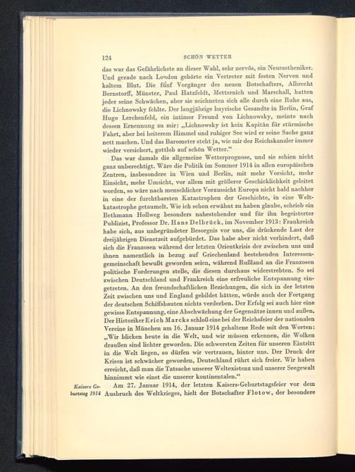 das war das Gefährlichste an dieser Wahl, sehr nervös, ein Neurastheniker.Und gerade nach London gehörte ein Vertreter mit festen Nerven undkaltem Blut. Die fünf Vorgänger des neuen Botschafters, AlbrechtBernstorfF, Münster, Paul Hatzfeldt, Metternich und Marschall, hattenjeder seine Schwächen, aber sie zeichneten sich alle durch eine Ruhe aus,die Lichnowsky fehlte. Der langjährige bayrische Gesandte in Berlin , GrafHugo Lerchenfeld, ein intimer Freund von Lichnowsky, meinte nachdessen Ernennung zu mir: „Lichnowsky ist kein Kapitän für stürmischeFahrt, aber bei heiterem Himmel und ruhiger See wird er seine Sache ganznett machen. Und das Barometer steht ja, wie mir der Reichskanzler immerwieder versichert, gottlob auf schön Wetter."