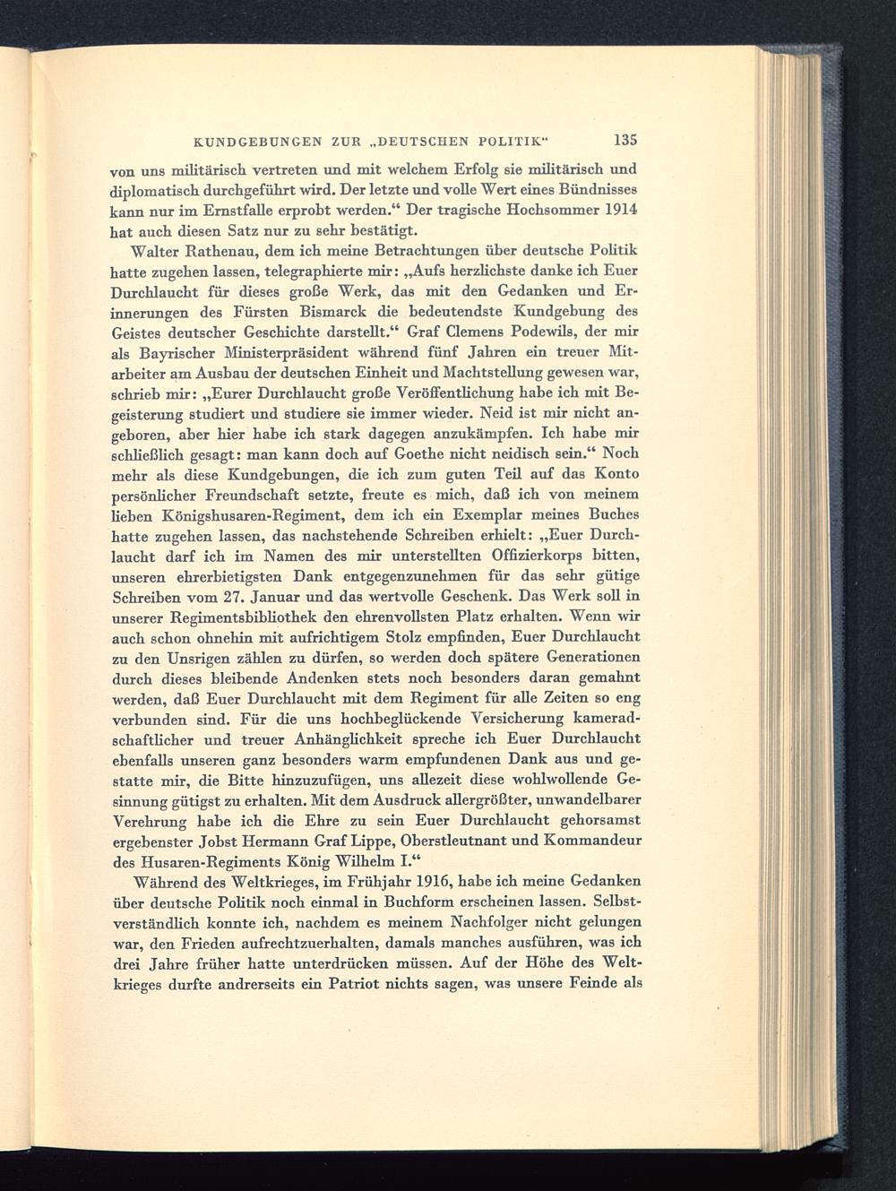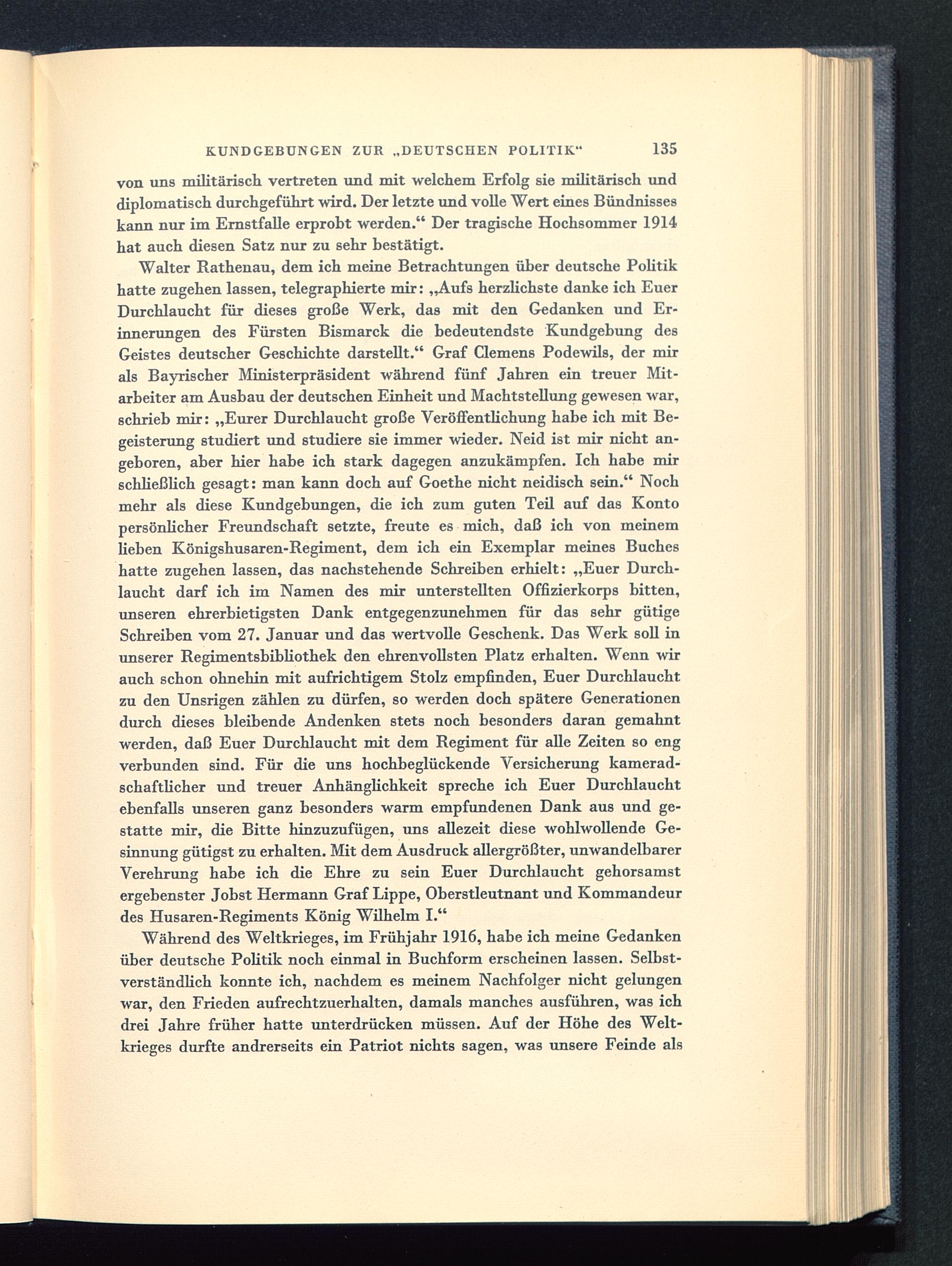 Walter Rathenau, dem ich meine Betrachtungen über deutsche Politikhatte zugehen lassen, telegraphierte mir: „Aufs herzlichste danke ich EuerDurchlaucht für dieses große Werk, das mit den Gedanken und Er-innerungen des Fürsten Bismarck die bedeutendste Kundgebimg desGeistes deutscher Geschichte darstellt." Graf Clemens Podewils , der mirals Bayrischer Ministerpräsident während fünf Jahren ein treuer Mit-arbeiter am Ausbau der deutschen Einheit und Machtstellung gewesen war,schrieb mir: „Eurer Durchlaucht große Veröffentlichung habe ich mit Be-geisterung studiert und studiere sie immer wieder. Neid ist mir nicht an-geboren, aber hier habe ich stark dagegen anzukämpfen. Ich habe mirschließlich gesagt: man kann doch auf Goethe nicht neidisch sein." Nochmehr als diese Kundgebungen, die ich zum guten Teil auf das Kontopersönlicher Freundschaft setzte, freute es mich, daß ich von meinemlieben Königshusaren-Regiment, dem ich ein Exemplar meines Bucheshatte zugehen lassen, das nachstehende Schreiben erhielt: „Euer Durch-laucht darf ich im Namen des mir unterstellten Offizierkorps bitten,unseren ehrerbietigsten Dank entgegenzunehmen für das sehr gütigeSchreiben vom 27. Januar und das wertvolle Geschenk. Das Werk soll inunserer Regimentsbibliothek den ehrenvollsten Platz erhalten. Wenn wirauch schon ohnehin mit aufrichtigem Stolz empfinden, Euer Durchlauchtzu den Unsrigen zählen zu dürfen, so werden doch spätere Generationendurch dieses bleibende Andenken stets noch besonders daran gemahntwerden, daß Euer Durchlaucht mit dem Regiment für alle Zeiten so engverbunden sind. Für die uns hochbeglückende Versicherung kamerad-schaftlicher und treuer Anhänglichkeit spreche ich Euer Durchlauchtebenfalls unseren ganz besonders warm empfundenen Dank aus und ge-statte mir, die Bitte hinzuzufügen, uns allezeit diese wohlwollende Ge-sinnung gütigst zu erhalten. Mit dem Ausdruck allergrößter, unwandelbarerVerehrung habe ich die Ehre zu sein Euer Durchlaucht gehorsamstergebenster Jobst Hermann Graf Lippe, Oberstleutnant und Kommandeurdes Husaren-Regiments König Wilhelm I."