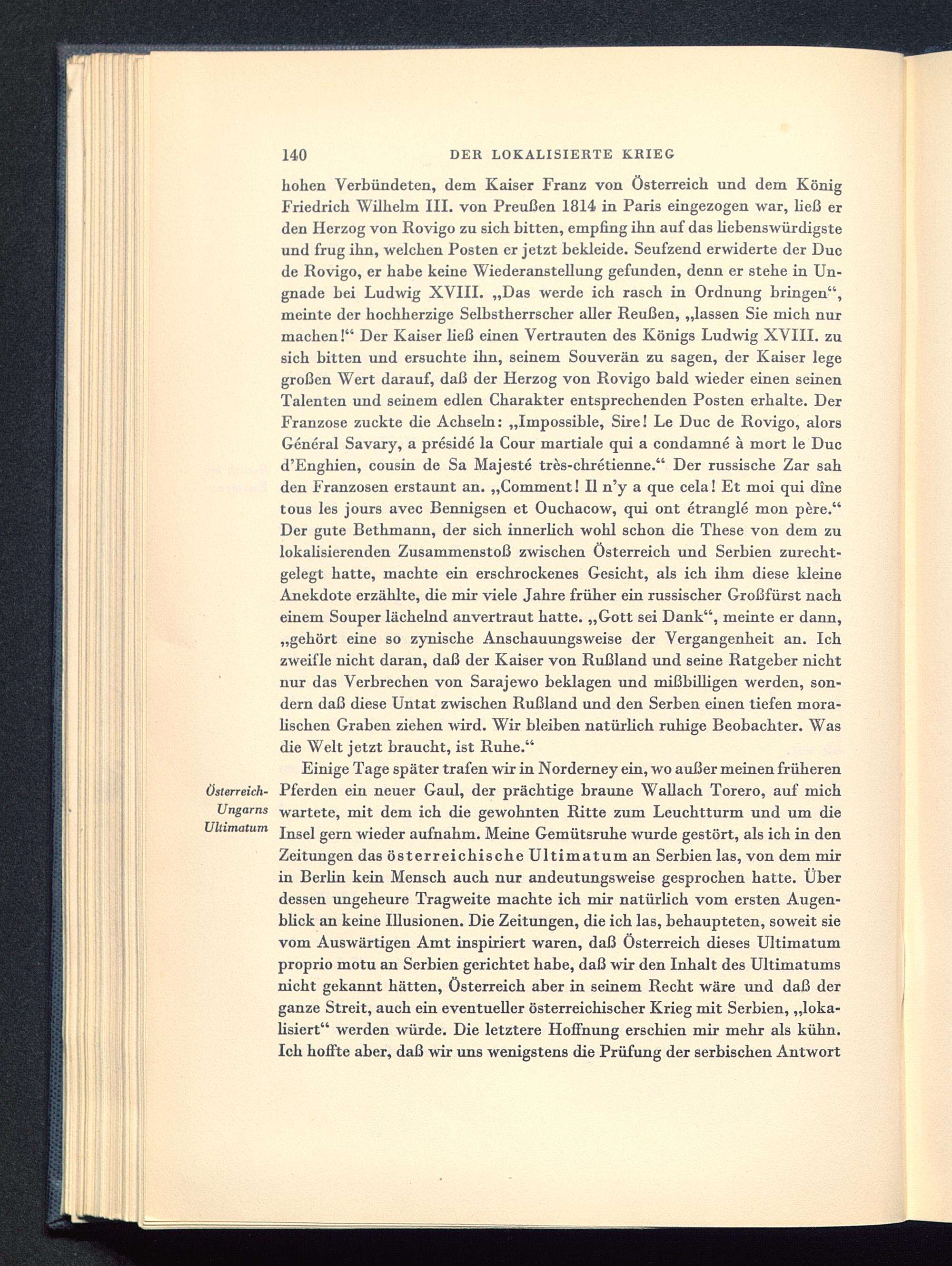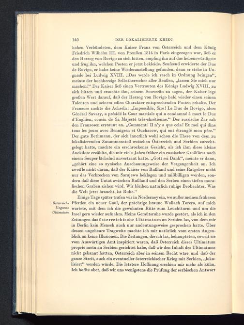 hohen Verbündeten, dem Kaiser Franz von Österreich und dem KönigFriedrich Wilhelm III. von Preußen 1814 in Paris eingezogen war, ließ erden Herzog von Rovigo zu sich bitten, empfing ihn auf das hebenswürdigsteund frug ihn, welchen Posten er jetzt bekleide. Seufzend erwiderte der Ducde Rovigo , er habe keine Wiederanstellung gefunden, denn er stehe in Un-gnade bei Ludwig XVIII. „Das werde ich rasch in Ordnung bringen",meinte der hochherzige Selbstherrscher aller Reußen, „lassen Sie mich nurmachen!" Der Kaiser ließ einen Vertrauten des Königs Ludwig XVIII. zusich bitten und ersuchte ihn, seinem Souverän zu sagen, der Kaiser legegroßen Wert darauf, daß der Herzog von Rovigo bald wieder einen seinenTalenten und seinem edlen Charakter entsprechenden Posten erhalte. DerFranzose zuckte die Achseln: „Impossible, Sire! Le Duc de Rovigo , alorsGeneral Savary, a preside la Cour martiale qui a condamne ä mort le Ducd'Enghien, cousin de Sa Majeste tres-chretienne." Der russische Zar sahden Franzosen erstaunt an. „Comment! II n'y a que cela! Et moi qui dinetous les jours avec Bennigsen et Ouchacow, qui ont etrangle mon pere."Der gute Bethmann, der sich innerlich wohl schon die These von dem zulokalisierenden Zusammenstoß zwischen Österreich und Serbien zurecht-gelegt hatte, machte ein erschrockenes Gesicht, als ich ihm diese kleineAnekdote erzählte, die mir viele Jahre früher ein russischer Großfürst nacheinem Souper lächelnd anvertraut hatte. „Gott sei Dank", meinte er dann,„gehört eine so zynische Anschauungsweise der Vergangenheit an. Ichzweifle nicht daran, daß der Kaiser von Rußland und seine Ratgeber nichtnur das Verbrechen von Sarajewo beklagen und mißbilligen werden, son-dern daß diese Untat zwischen Rußland und den Serben einen tiefen mora-lischen Graben ziehen wird. Wir bleiben natürlich ruhige Beobachter. Wasdie Welt jetzt braucht, ist Ruhe."