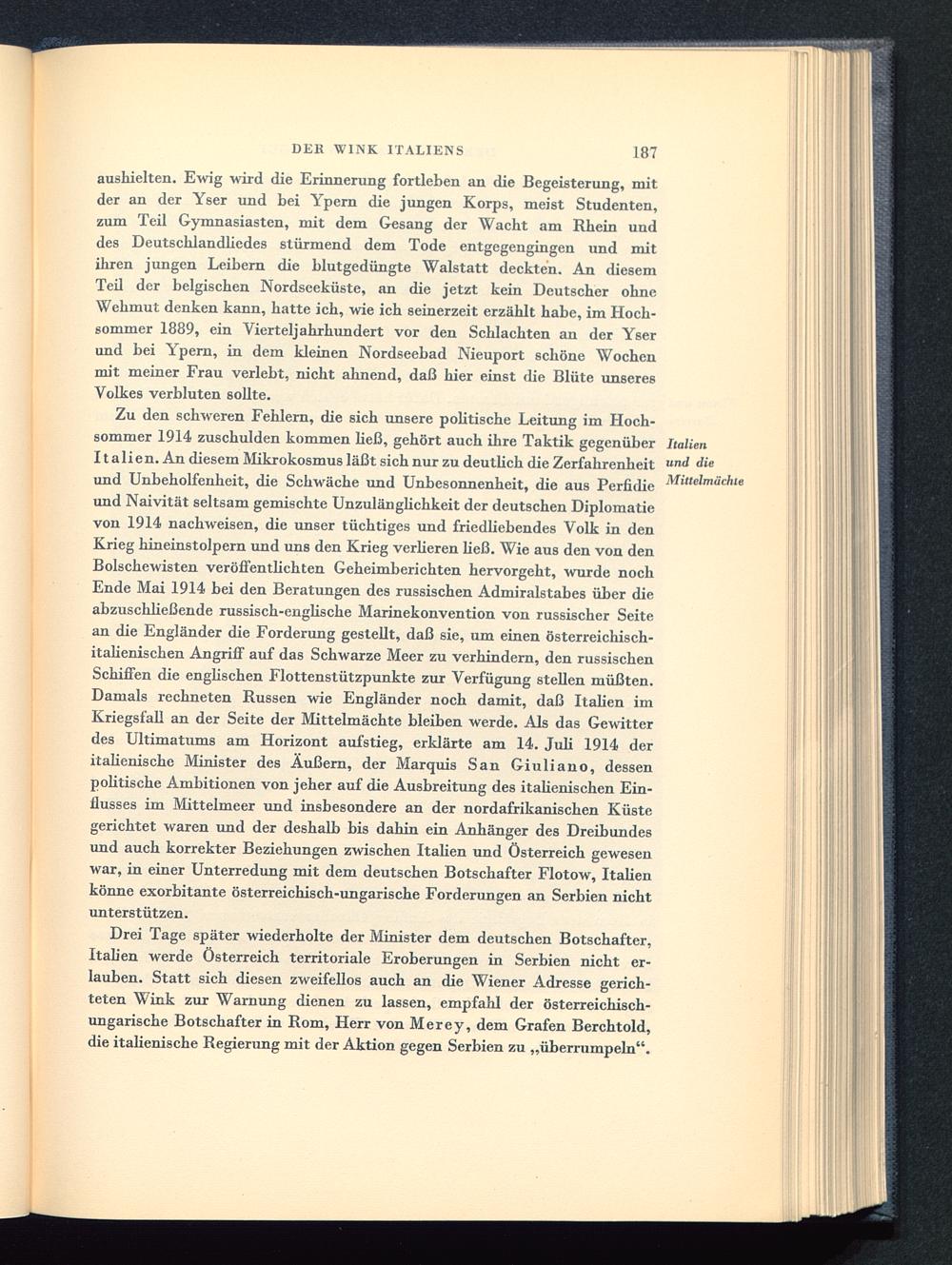 Zu den schweren Fehlern, die sich unsere politische Leitung im Hoch-sommer 1914 zuschulden kommen ließ, gehört auch ihre Taktik gegenüber ItalienItalien . An diesem Mikrokosmus läßt sich nur zu deutüch die Zerfahrenheitund Unbeholfenheit, die Schwäche und Unbesonnenheit, die aus Perfidie Mlttelm 'und Naivität seltsam gemischte Unzulänglichkeit der deutschen Diplomatievon 1914 nachweisen, die unser tüchtiges und friedliebendes Volk in denKrieg hineinstolpern und uns den Krieg verHeren ließ. Wie aus den von denBolschewisten veröffentlichten Geheimberichten hervorgeht, wurde nochEnde Mai 1914 bei den Beratungen des russischen Admiralstabes über dieabzuschließende russisch -englische Marinekonvention von russischer Seitean die Engländer die Forderung gestellt, daß sie, um einen österreichisch-italienischen Angriff auf das Schwarze Meer zu verhindern, den russischen Schiffen die englischen Flottenstützpunkte zur Verfügung stellen müßten.Damals rechneten Russen wie Engländer noch damit, daß Italien imKriegsfall an der Seite der Mittelmächte bleiben werde. Als das Gewitterdes Ultimatums am Horizont aufstieg, erklärte am 14. Juli 1914 deritalienische Minister des Äußern, der Marquis San Giuliano, dessenpolitische Ambitionen von jeher auf die Ausbreitung des italienischen Ein-flusses im Mittelmeer und insbesondere an der nordafrikanischen Küstegerichtet waren und der deshalb bis dahin ein Anhänger des Dreibundesund auch korrekter Beziehungen zwischen Italien und Österreich gewesenwar, in einer Unterredung mit dem deutschen Botschafter Flotow, Italien könne exorbitante österreichisch-ungarische Forderungen an Serbien nichtunterstützen.