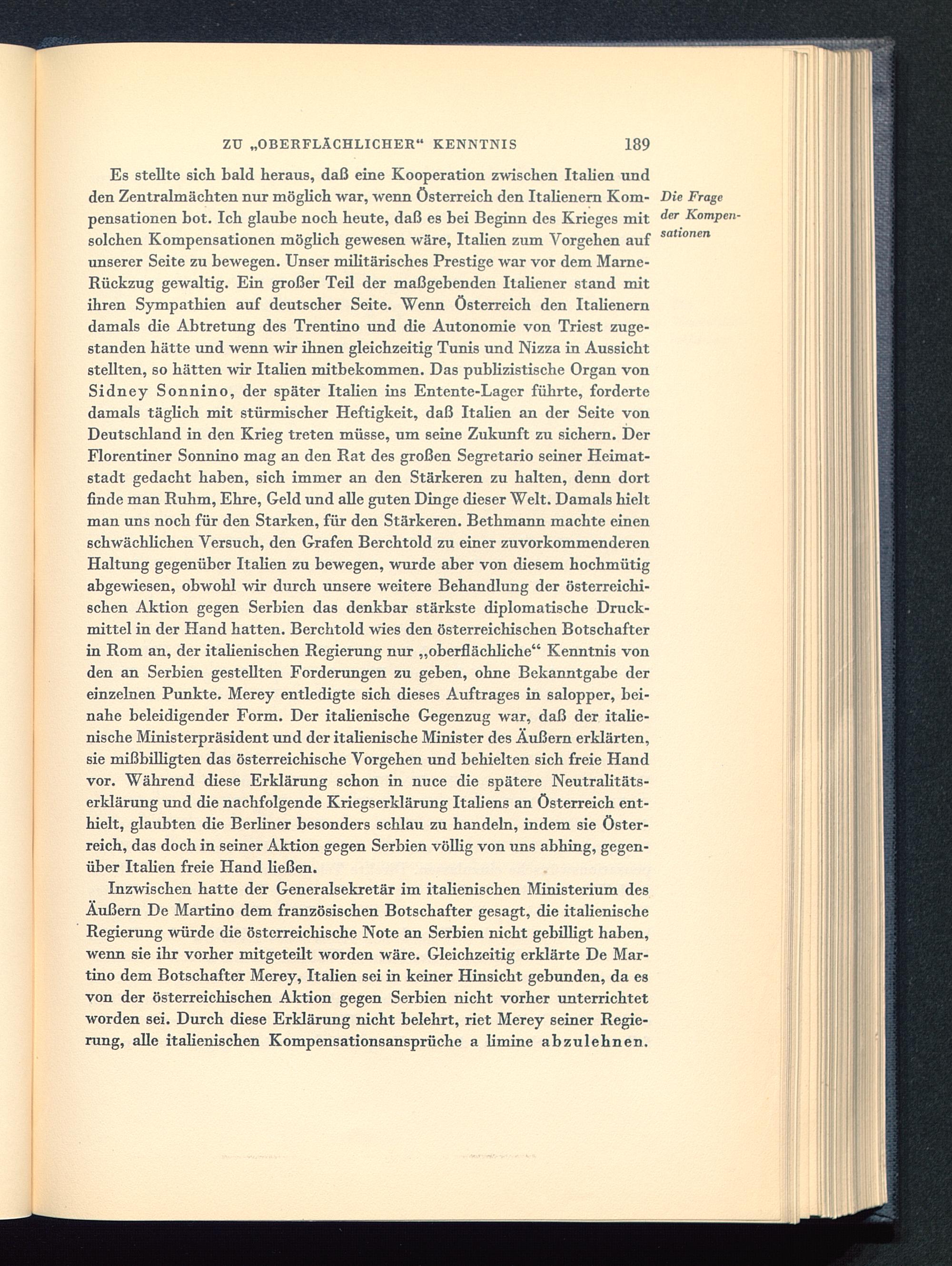 Inzwischen hatte der Generalsekretär im italienischen Ministerium desÄußern De Martino dem französischen Botschafter gesagt, die italienischeRegierung würde die österreichische Note an Serbien nicht gebilligt haben,wenn sie ihr vorher mitgeteilt worden wäre. Gleichzeitig erklärte De Mar-tino dem Botschafter Merey, Italien sei in keiner Hinsicht gebunden, da esvon der österreichischen Aktion gegen Serbien nicht vorher unterrichtetworden sei. Durch diese Erklärung nicht belehrt, riet Merey seiner Regie-rung, alle italienischen Kompensationsansprüche a limine abzulehnen.