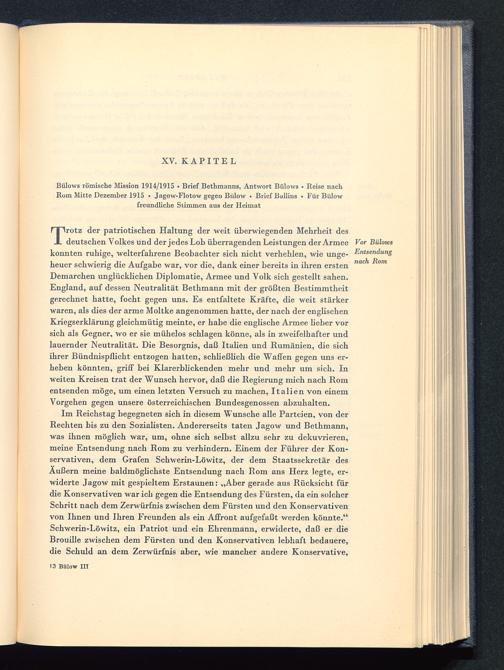 Bülows römische Mission 1914/1915 • Brief Bethmanns, Antwort Bülows • Reise nachRom Mitte Dezember 1915 • Jagow-Flotow gegeu Bülow • Brief Bullins • Für Bülowfreundliche Stimmen aus der Heimat