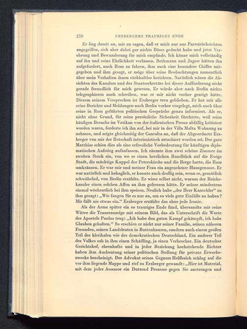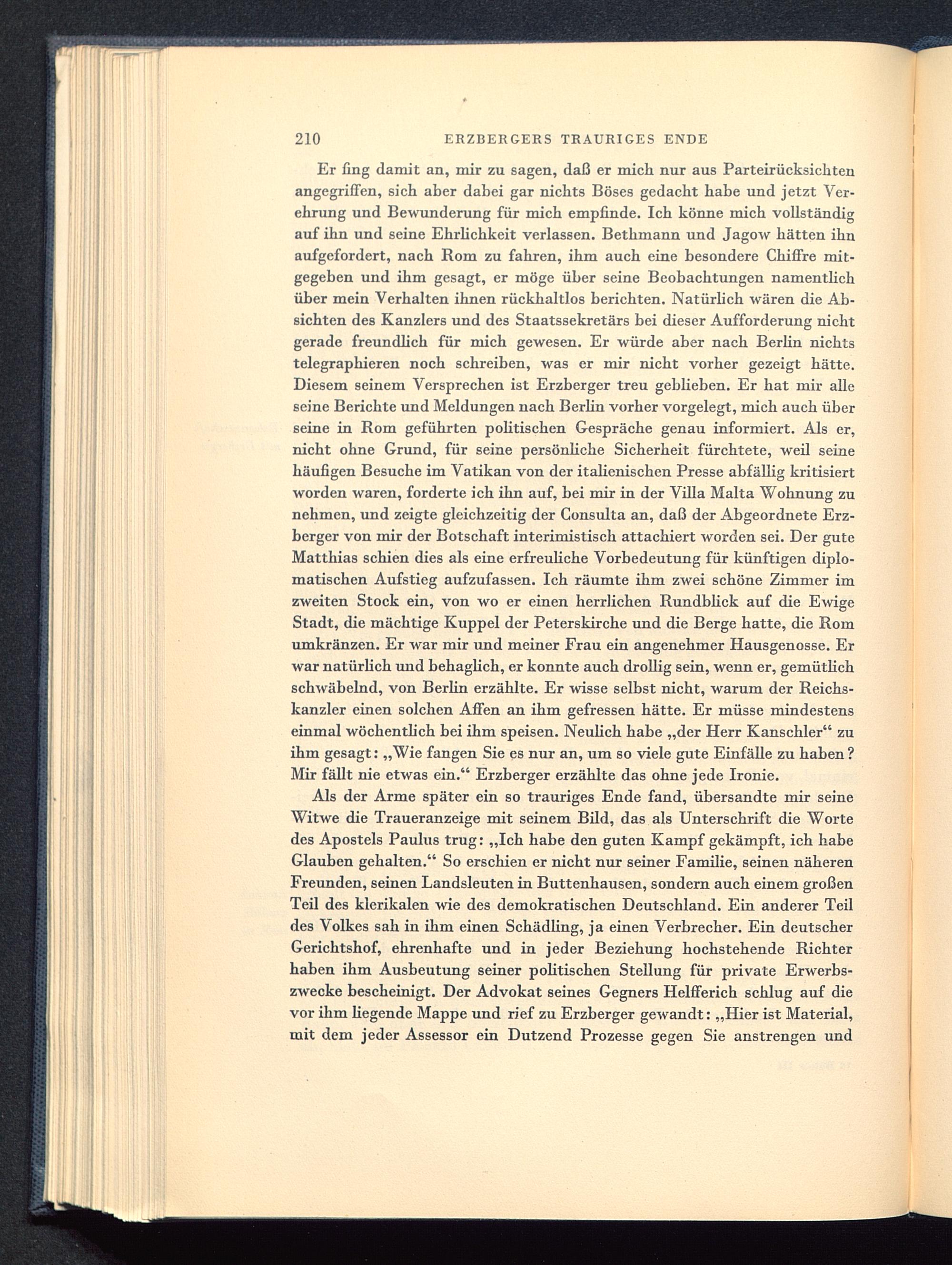 Als der Arme später ein so trauriges Ende fand, übersandte mir seineWitwe die Traueranzeige mit seinem Bild, das als Unterschrift die Wortedes Apostels Paulus trug: „Ich habe den guten Kampf gekämpft, ich habeGlauben gehalten." So erschien er nicht nur seiner Familie, seinen näherenFreunden, seinen Landsleuten in Buttenhausen, sondern auch einem großenTeil des klerikalen wie des demokratischen Deutschland . Ein anderer Teildes Volkes sah in ihm einen Schädling, ja einen Verbrecher. Ein deutscher Gerichtshof, ehrenhafte und in jeder Beziehung hochstehende Richterhaben ihm Ausbeutung seiner politischen Stellung für private Erwerbs-zwecke bescheinigt. Der Advokat seines Gegners Helfferich schlug auf dievor ihm hegende Mappe und rief zu Erzberger gewandt: „Hier ist Material,mit dem jeder Assessor ein Dutzend Prozesse gegen Sie anstrengen und