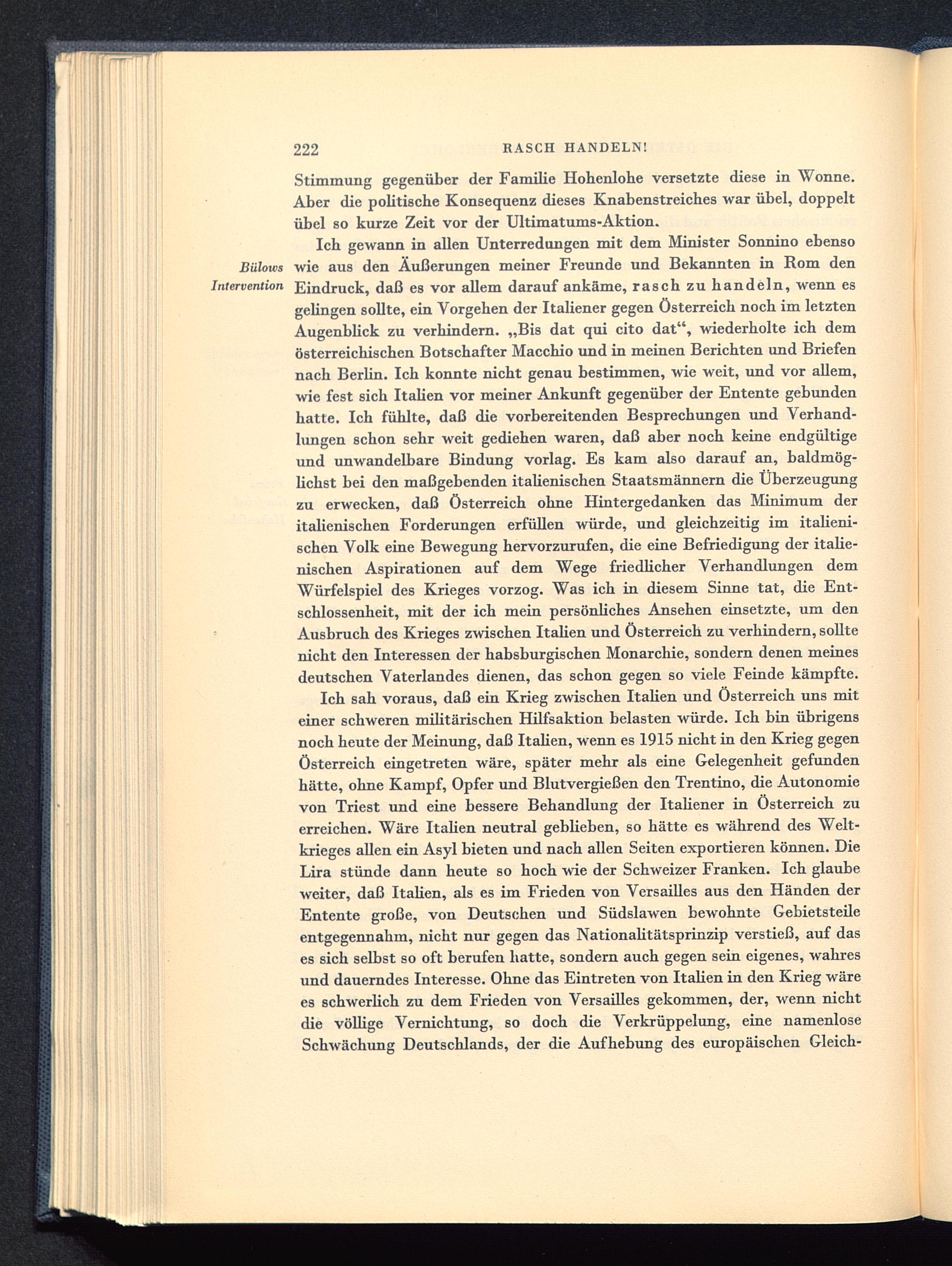 Ich sah voraus, daß ein Krieg zwischen Italien und Österreich uns miteiner schweren militärischen Hilfsaktion belasten würde. Ich bin übrigensnoch heute der Meinung, daß Italien , wenn es 1915 nicht in den Krieg gegenÖsterreich eingetreten wäre, später mehr als eine Gelegenheit gefundenhätte, ohne Kampf, Opfer und Blutvergießen den Trentino , die Autonomievon Triest und eine bessere Behandlung der Italiener in Österreich zuerreichen. Wäre Italien neutral geblieben, so hätte es während des Welt-krieges allen ein Asyl bieten und nach allen Seiten exportieren können. DieLira stünde dann heute so hoch wie der Schweizer Franken . Ich glaubeweiter, daß Italien, als es im Frieden von Versailles aus den Händen derEntente große, von Deutschen und Südslawen bewohnte Gebietsteileentgegennahm, nicht nur gegen das Nationalitätsprinzip verstieß, auf dases sich selbst so oft berufen hatte, sondern auch gegen sein eigenes, wahresund dauerndes Interesse. Ohne das Eintreten von Italien in den Krieg wärees schwerlich zu dem Frieden von Versailles gekommen, der, wenn nichtdie völlige Vernichtung, so doch die Verkrüppelung, eine namenloseSchwächung Deutschlands , der die Aufhebung des europäischen Gleich-
