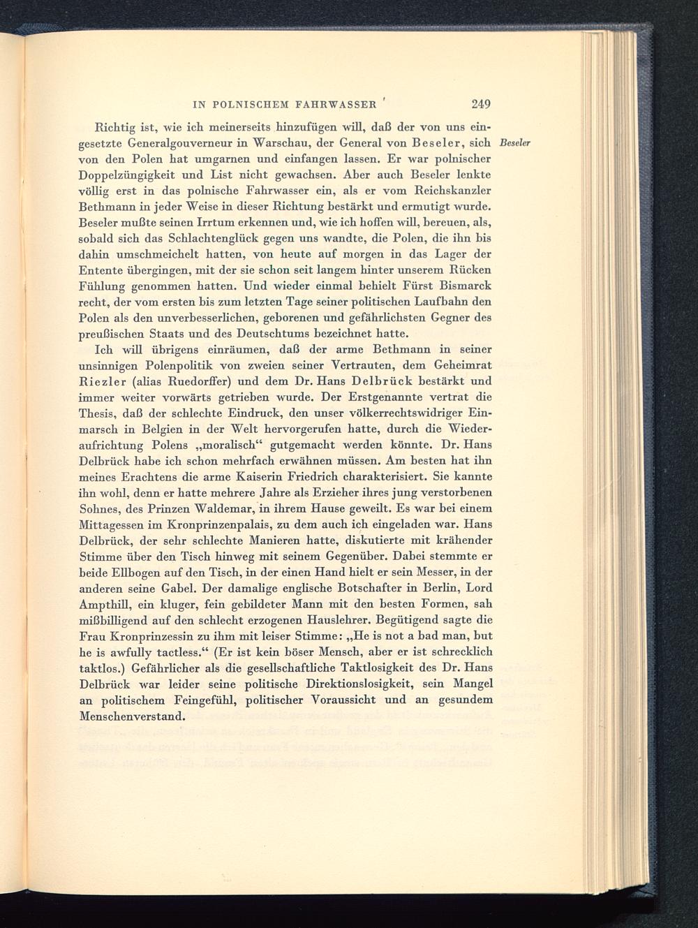 Ich will übrigens einräumen, daß der arme Bethmann in seinerunsinnigen Polenpolitik von zweien seiner Vertrauten, dem GeheimratRiezler (alias Ruedorffer) und dem Dr. Hans Delbrück bestärkt undimmer weiter vorwärts getrieben wurde. Der Erstgenannte vertrat dieThesis, daß der schlechte Eindruck, den unser völkerrechtswidriger Ein-marsch in Belgien in der Welt hervorgerufen hatte, durch die Wieder-aufrichtung Polens „moralisch" gutgemacht werden könnte. Dr. HansDelbrück habe ich schon mehrfach erwähnen müssen. Am besten hat ihnmeines Erachtens die arme Kaiserin Friedrich charakterisiert. Sie kannteihn wohl, denn er hatte mehrere Jahre als Erzieher ihres jung verstorbenenSohnes, des Prinzen Waldemar, in ihrem Hause geweilt. Es war bei einemMittagessen im Kronprinzenpalais, zu dem auch ich eingeladen war. HansDelbrück , der sehr schlechte Manieren hatte, diskutierte mit krähenderStimme über den Tisch hinweg mit seinem Gegenüber. Dabei stemmte erbeide Ellbogen auf den Tisch, in der einen Hand hielt er sein Messer, in deranderen seine Gabel. Der damalige englische Botschafter in Berlin, LordAmpthill , ein kluger, fein gebildeter Mann mit den besten Formen, sahmißbilligend auf den schlecht erzogenen Hauslehrer. Begütigend sagte dieFrau Kronprinzessin zu ihm mit leiser Stimme: „He is not a bad man, buthe is awfully tactless." (Er ist kein böser Mensch, aber er ist schrecklichtaktlos.) Gefährlicher als die gesellschaftb'che Taktlosigkeit des Dr. HansDelbrück war leider seine politische Direktionslosigkeit, sein Mangelan politischem Feingefühl, politischer Voraussicht und an gesundemMenschenverstand.