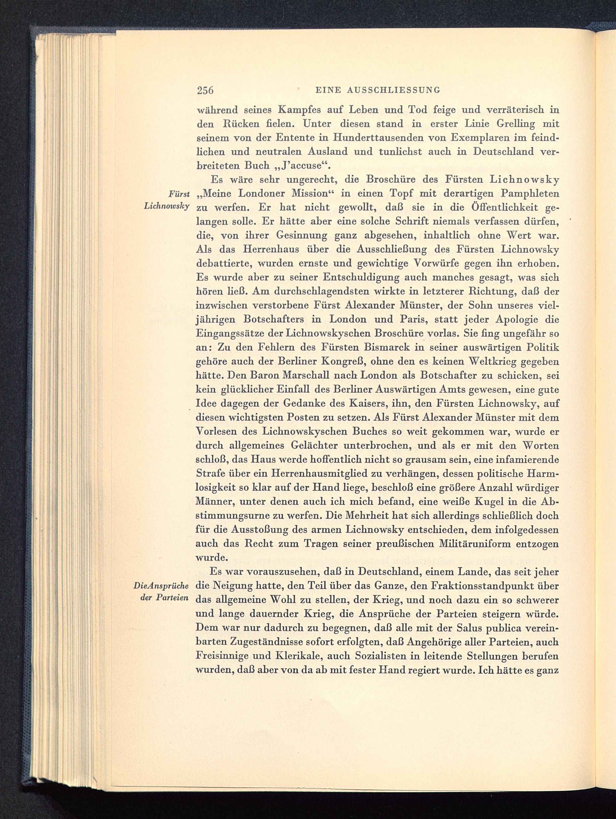 Es wäre sehr ungerecht, die Broschüre des Fürsten LichnowskyFürst „Meine Londoner Mission" in einen Topf mit derartigen PamphletenLichnowsky zu we rfen. Er hat nicht gewollt, daß sie in die Öffenthchkeit ge-langen solle. Er hätte aber eine solche Schrift niemals verfassen dürfen,die, von ihrer Gesinnung ganz abgesehen, inhaltlich ohne Wert war.Als das Herrenhaus über die Ausschließung des Fürsten Lichnowskydebattierte, wurden ernste und gewichtige Vorwürfe gegen ihn erhoben.Es wurde aber zu seiner Entschuldigung auch manches gesagt, was sichhören ließ. Am durchschlagendsten wirkte in letzterer Richtung, daß derinzwischen verstorbene Fürst Alexander Münster, der Sohn unseres viel-jährigen Botschafters in London und Paris , statt jeder Apologie dieEingangssätze der Lichnowskyschen Broschüre vorlas. Sie fing ungefähr soan: Zu den Fehlern des Fürsten Bismarck in seiner auswärtigen Politikgehöre auch der Berliner Kongreß, ohne den es keinen Weltkrieg gegebenhätte. Den Baron Marschall nach London als Botschafter zu schicken, seikein glücklicher Einfall des Berliner Auswärtigen Amts gewesen, eine guteIdee dagegen der Gedanke des Kaisers, ihn, den Fürsten Lichnowsky , aufdiesen wichtigsten Posten zu setzen. Als Fürst Alexander Münster mit demVorlesen des Lichnowskyschen Buches so weit gekommen war, wurde erdurch allgemeines Gelächter unterbrochen, und als er mit den Wortenschloß, das Haus werde hoffentlich nicht so grausam sein, eine infamierendeStrafe über ein Herrenhausmitglied zu verhängen, dessen politische Harm-losigkeit so klar auf der Hand hege, beschloß eine größere Anzahl würdigerMänner, unter denen auch ich mich befand, eine weiße Kugel in die Ab-stimmungsurne zu werfen. Die Mehrheit hat sich allerdings schließlich dochfür die Ausstoßung des armen Lichnowsky entschieden, dem infolgedessenauch das Recht zum Tragen seiner preußischen Militäruniform entzogenwurde.