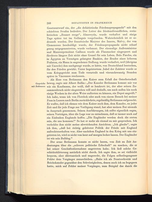 Gesetzentwurf ein, der „die defaitistische Friedenspropaganda" mit denschärfsten Strafen bedrohte. Der Leiter des friedensfreundlichen, sozia-listischen „Bonnet rouge", Almereyda, wurde verhaftet und einigeTage später tot im Gefängnis vorgefunden. Wahrscheinlich ist er er-drosselt worden. Der französische Minister des Innern, Malvy, der vonClemenceau beschuldigt wurde, der Friedenspropaganda nicht scharfgenug entgegenzutreten, wurde verbannt. Der ehemalige Außenministerund Ministerpräsident Caillaux wurde als Flaumacher eingesperrt undfürchtete längere Zeit nicht ohne Grund für sein Leben. Bolo Pascha, einin Ägypten zu Vermögen gelangter Bankier, der Bruder eines höherenPrälaten, ein Mann in angesehener Stellung, wurde verhaftet, weil (übrigensmit Unrecht) ihm nachgesagt wurde, er hätte, von Deutschland bestochen,für den Frieden gewirkt. Unter begeistertem Jubel der Zuhörer wurde ervom Kriegsgericht zum Tode verurteilt und vierundzwanzig Stundenspäter in Vincennes erschossen.