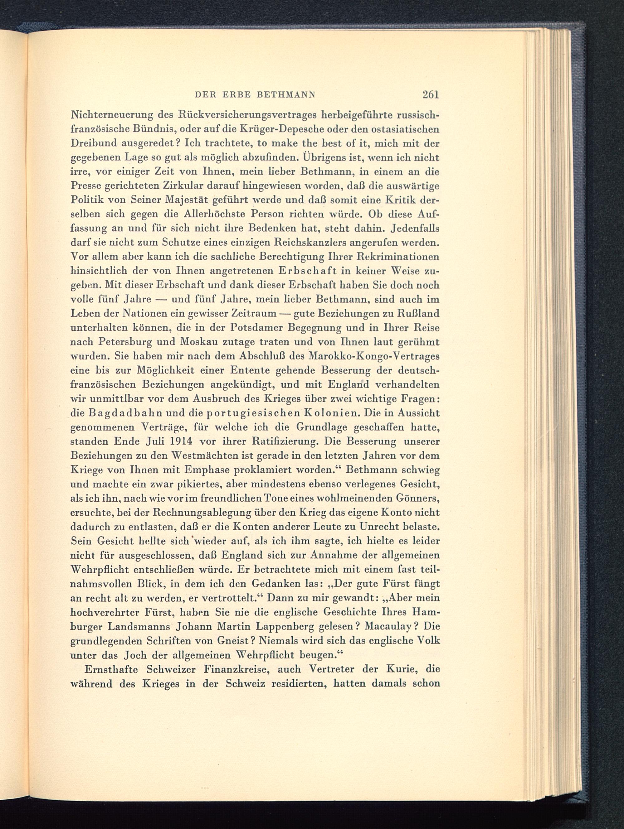 Nichterneuerung des RückVersicherungsvertrages herbeigeführte russisch-französische Bündnis, oder auf die Krüger-Depesche oder den ostasiatischenDreibund ausgeredet ? Ich trachtete, to make the best of it, mich mit dergegebenen Lage so gut als möglich abzufinden. Übrigens ist, wenn ich nichtirre, vor einiger Zeit von Ihnen, mein lieber Bethmann, in einem an diePresse gerichteten Zirkular darauf hingewiesen worden, daß die auswärtigePolitik von Seiner Majestät geführt werde und daß somit eine Kritik der-selben sich gegen die Allerhöchste Person richten würde. Ob diese Auf-fassung an und für sich nicht ihre Bedenken hat, steht dahin. Jedenfallsdarf sie nicht zum Schutze eines einzigen Reichskanzlers angerufen werden.Vor allem aber kann ich die sachliche Berechtigung Ihrer Rekriminationenhinsichtlich der von Ihnen angetretenen Erbschaft in keiner Weise zu-geben. Mit dieser Erbschaft und dank dieser Erbschaft haben Sie doch nochvolle fünf Jahre — und fünf Jahre, mein lieber Bethmann, sind auch imLeben der Nationen ein gewisser Zeitraum — gute Beziehungen zu Rußland unterhalten können, die in der Potsdamer Begegnung und in Ihrer Reisenach Petersburg und Moskau zutage traten und von Ihnen laut gerühmtwurden. Sie haben mir nach dem Abschluß des Marokko-Kongo-Vertrageseine bis zur Möglichkeit einer Entente gehende Besserung der deutsch-französischen Beziehungen angekündigt, und mit England verhandeltenwir unmittlbar vor dem Ausbruch des Krieges über zwei wichtige Fragen:die Bagdadbahn und die portugiesischen Kolonien. Die in Aussichtgenommenen Verträge, für welche ich die Grundlage geschaffen hatte,standen Ende Juli 1914 vor ihrer Ratifizierung. Die Besserung unsererBeziehungen zu den Westmächten ist gerade in den letzten Jahren vor demKriege von Ihnen mit Emphase proklamiert worden." Bethmann schwiegund machte ein zwar pikiertes, aber mindestens ebenso verlegenes Gesicht,als ich ihn, nach wie vor im freundlichen Tone eines wohlmeinenden Gönners,ersuchte, bei der Rechnungsablegung über den Krieg das eigene Konto nichtdadurch zu entlasten, daß er die Konten anderer Leute zu Unrecht belaste.Sein Gesicht hellte sieh'wieder auf, als ich ihm sagte, ich hielte es leidernicht für ausgeschlossen, daß England sich zur Annahme der allgemeinenWehrpflicht entschließen würde. Er betrachtete mich mit einem fast teil-nahmsvollen Blick, in dem ich den Gedanken las: „Der gute Fürst fängtan recht alt zu werden, er vertrottelt." Dann zu mir gewandt: „Aber meinhochverehrter Fürst, haben Sie nie die englische Geschichte Ihres Ham-burger Landsmanns Johann Martin Lappenberg gelesen? Macaulay? Diegrundlegenden Schriften von Gneist? Niemals wird sich das englische Volkunter das Joch der allgemeinen Wehrpflicht beugen."