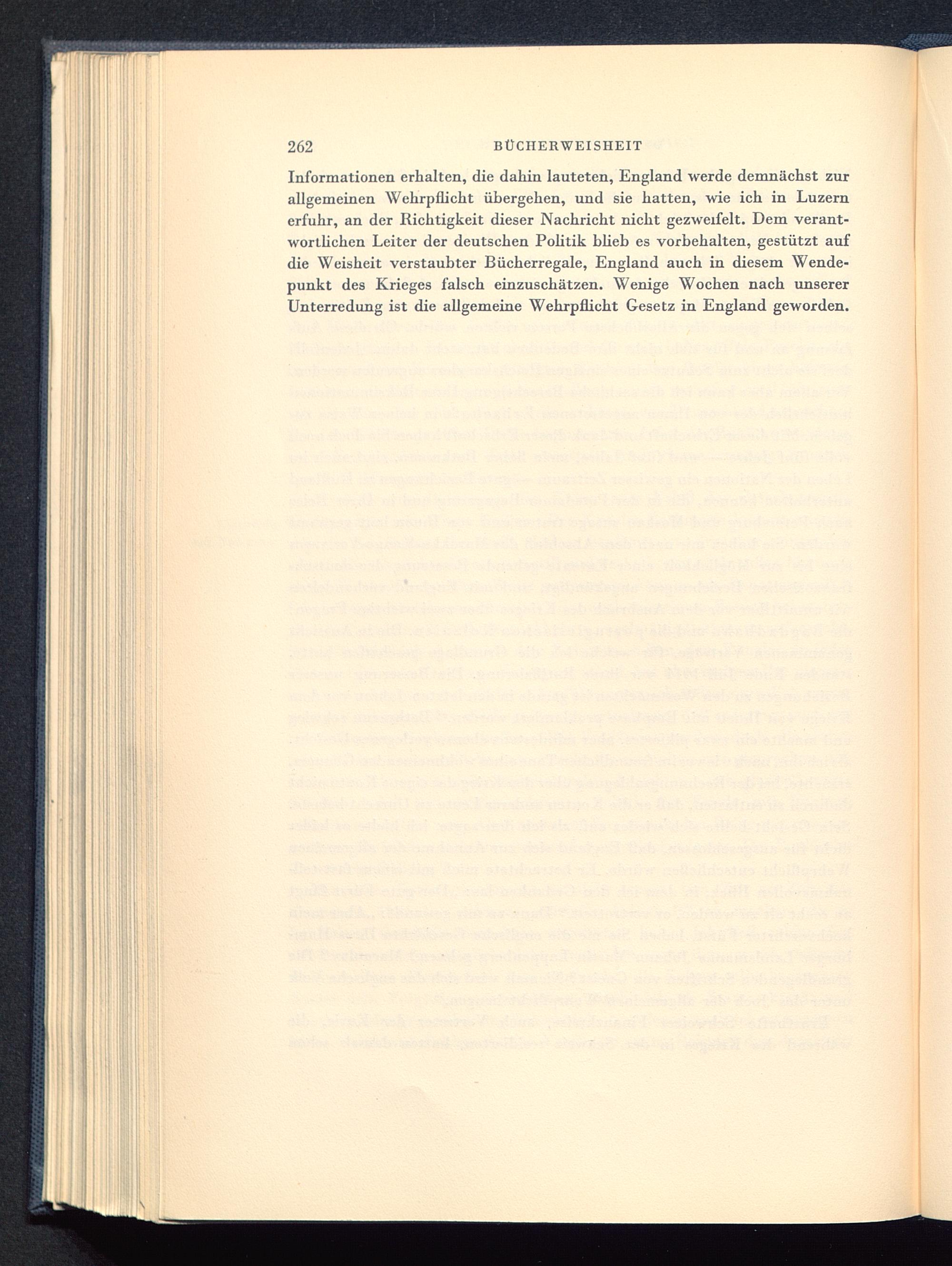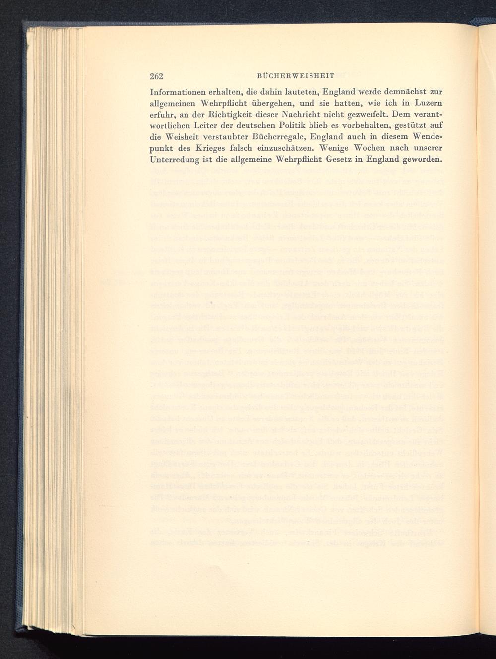 Informationen erhalten, die dahin lauteten, England werde demnächst zurallgemeinen Wehrpflicht übergehen, und sie hatten, wie ich in Luzern erfuhr, an der Richtigkeit dieser Nachricht nicht gezweifelt. Dem verant-wortlichen Leiter der deutschen Politik blieb es vorbehalten, gestützt aufdie Weisheit verstaubter Bücherregale, England auch in diesem Wende-punkt des Krieges falsch einzuschätzen. Wenige Wochen nach unsererUnterredung ist die allgemeine Wehrpflicht Gesetz in England geworden.