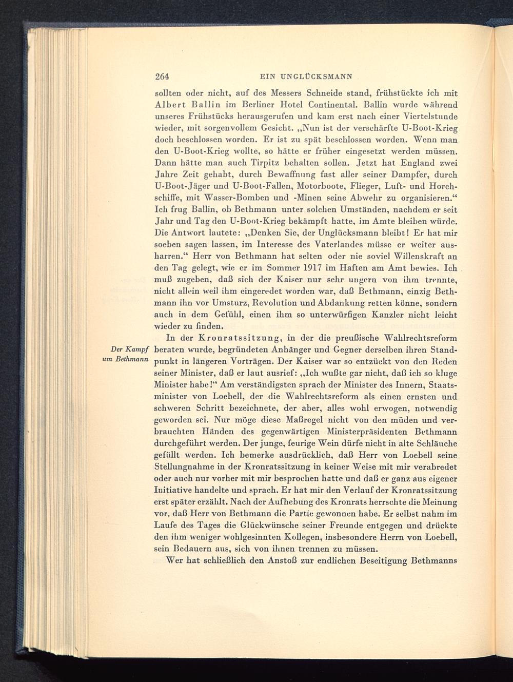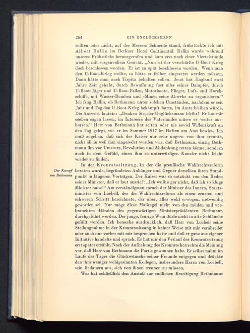 sollten oder nicht, auf des Messers Schneide stand, frühstückte ich mitAlbert Ballin im Berliner Hotel Continental. Ballin wurde währendunseres Frühstücks herausgerufen und kam erst nach einer Viertelstundewieder, mit sorgenvollem Gesicht. „Nun ist der verschärfte U-Boot-Kriegdoch beschlossen worden. Er ist zu spät beschlossen worden. Wenn manden U-Boot-Krieg wollte, so hätte er früher eingesetzt werden müssen.Dann hätte man auch Tirpitz behalten sollen. Jetzt hat England zweiJahre Zeit gehabt, durch Bewaffnung fast aller seiner Dampfer, durchU-Boot-Jäger und U-Boot-Fallen, Motorboote, Flieger, Luft- und Horch-schiffe, mit Wasser-Bomben und -Minen seine Abwehr zu organisieren."Ich frug Ballin, ob Bethmann unter solchen Umständen, nachdem er seitJahr und Tag den U-Boot-Krieg bekämpft hatte, im Amte bleiben würde.Die Antwort lautete: „Denken Sie, der Unglücksmann bleibt! Er hat mirsoeben sagen lassen, im Interesse des Vaterlandes müsse er weiter aus-harren." Herr von Bethmann hat selten oder nie soviel Willenskraft anden Tag gelegt, wie er im Sommer 1917 im Haften am Amt bewies. Ichmuß zugeben, daß sich der Kaiser nur sehr ungern von ihm trennte,nicht allein weil ihm eingeredet worden war, daß Bethmann, einzig Beth-mann ihn vor Umsturz, Bevolution und Abdankung retten könne, sondernauch in dem Gefühl, einen ihm so unterwürfigen Kanzler nicht leichtwieder zu finden.