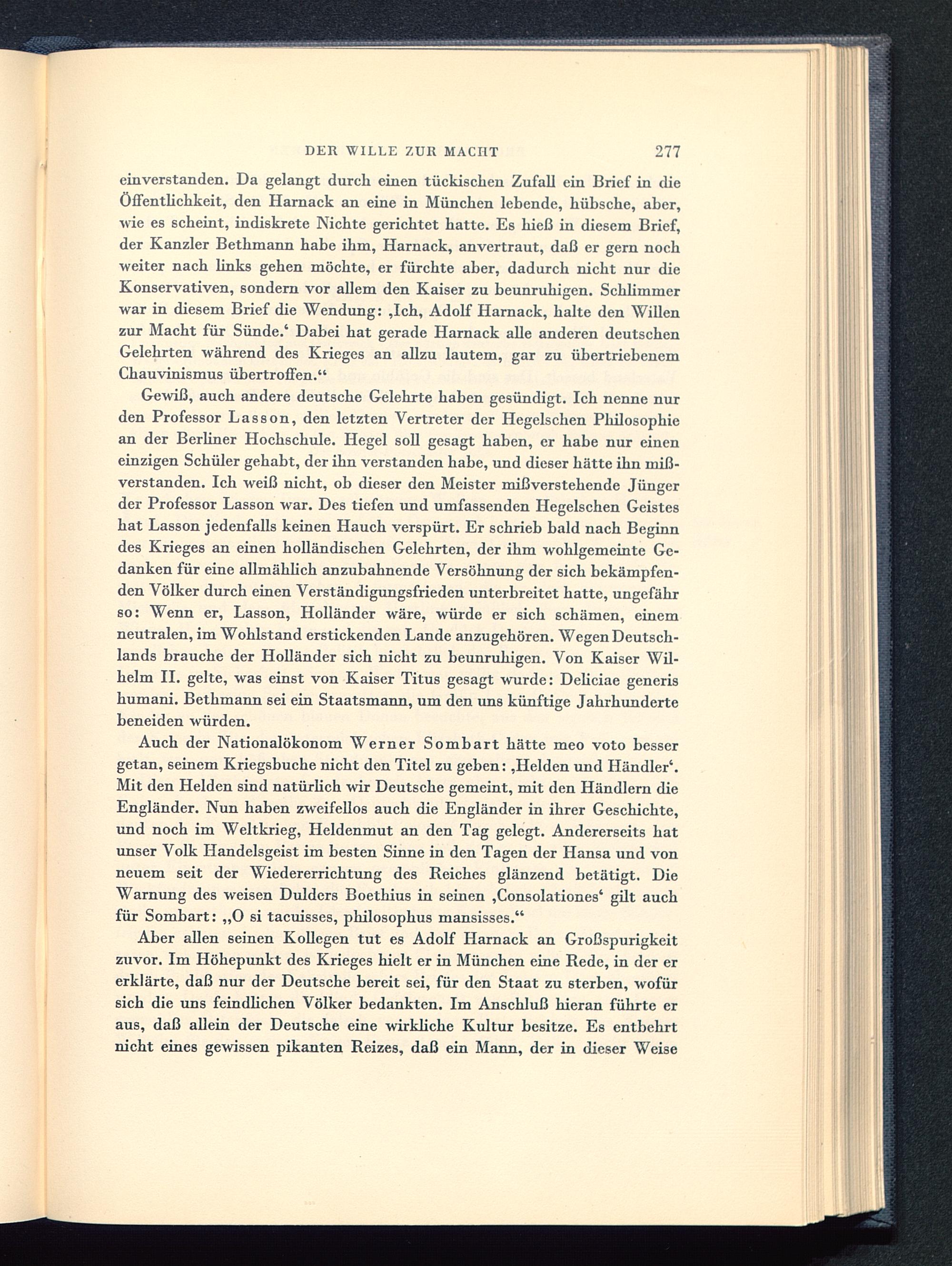 Aber allen seinen Kollegen tut es Adolf Harnack an Großspurigkeitzuvor. Im Höhepunkt des Krieges hielt er in München eine Rede, in der ererklärte, daß nur der Deutsche bereit sei, für den Staat zu sterben, wofürsich die uns feindlichen Völker bedankten. Im Anschluß hieran führte eraus, daß allein der Deutsche eine wirkliche Kultur besitze. Es entbehrtnicht eines gewissen pikanten Reizes, daß ein Mann, der in dieser Weise