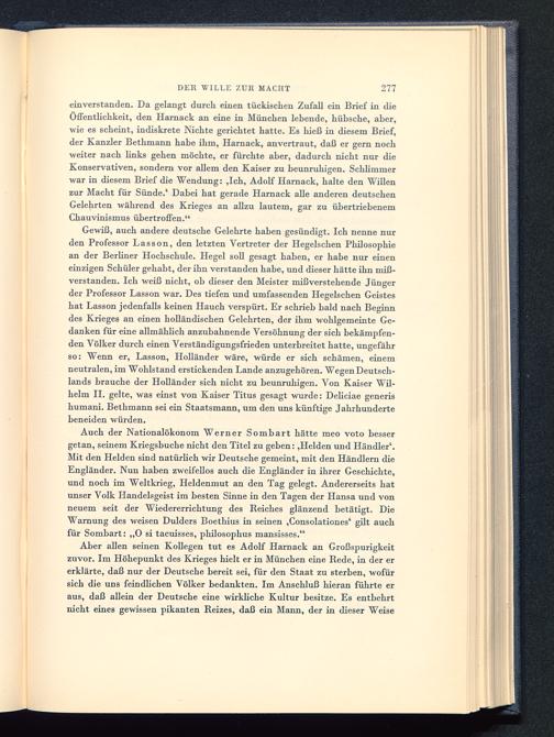 Gewiß, auch andere deutsche Gelehrte haben gesündigt. Ich nenne nurden Professor Lasson, den letzten Vertreter der Hegeischen Philosophiean der Berliner Hochschule. Hegel soll gesagt haben, er habe nur eineneinzigen Schüler gehabt, der ihn verstanden habe, und dieser hätte ihn miß-verstanden. Ich weiß nicht, ob dieser den Meister mißverstehende Jüngerder Professor Lasson war. Des tiefen und umfassenden Hegeischen Geisteshat Lasson jedenfalls keinen Hauch verspürt. Er schrieb bald nach Beginndes Krieges an einen holländischen Gelehrten, der ihm wohlgemeinte Ge-danken für eine allmählich anzubahnende Versöhnung der sich bekämpfen-den Völker durch einen Verständigungsfrieden unterbreitet hatte, ungefährso: Wenn er, Lasson, Holländer wäre, würde er sich schämen, einemneutralen, im Wohlstand erstickenden Lande anzugehören. Wegen Deutsch-lands brauche der Holländer sich nicht zu beunruhigen. Von Kaiser Wil-helm II. gelte, was einst von Kaiser Titus gesagt wurde: Deliciae generishumani. Bethmann sei ein Staatsmann, um den uns künftige Jahrhundertebeneiden würden.