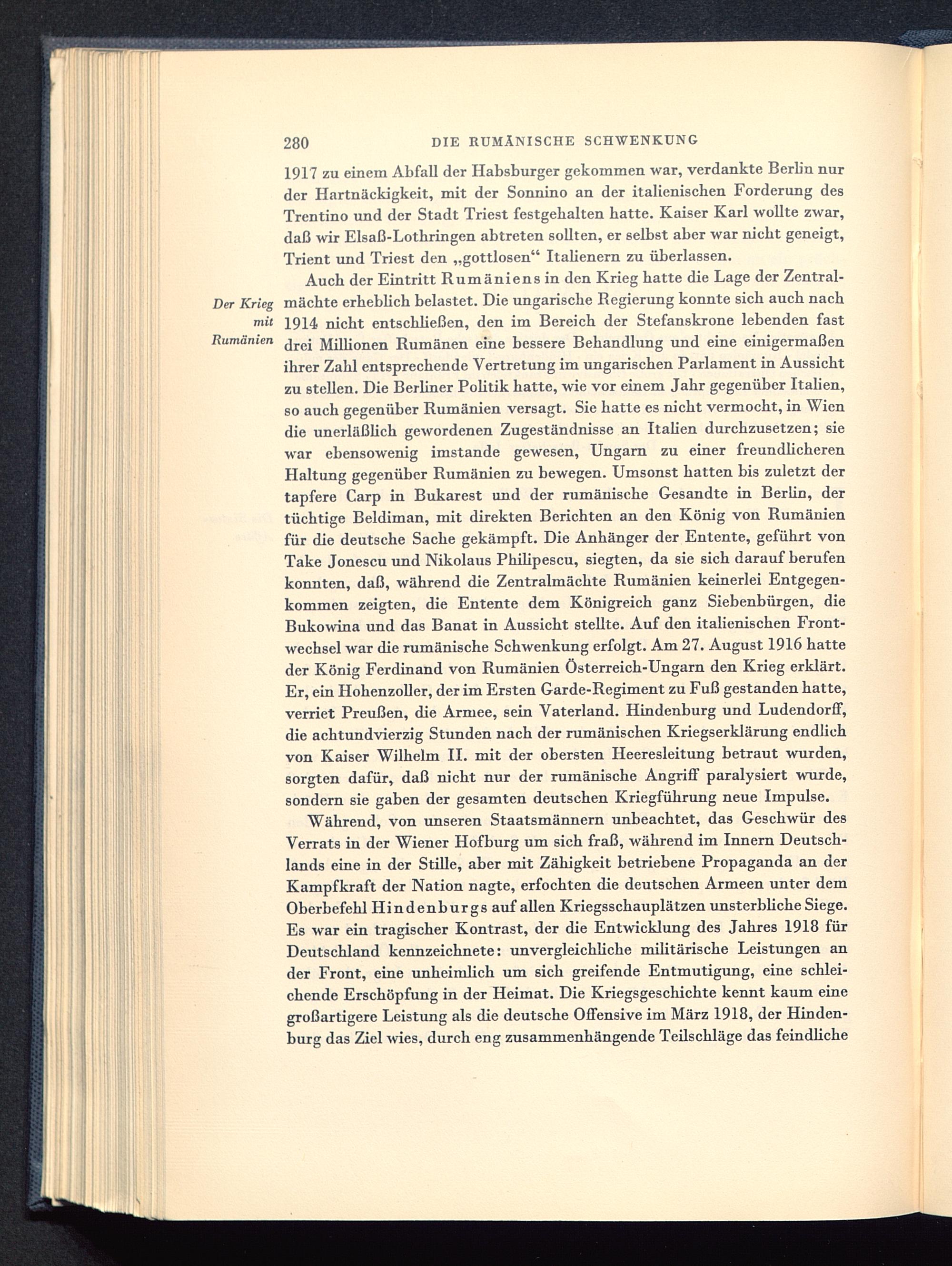 Auch der Eintritt Rumäniens in den Krieg hatte die Lage der Zentral-er Krieg mächte erheblich belastet. Die ungarische Regierung konnte sich auch nachmit 1914 nicht entschließen, den im Bereich der Stefanskrone lebenden fastRumänien Millionen Rumänen eine bessere Behandlung und eine einigermaßenihrer Zahl entsprechende Vertretung im ungarischen Parlament in Aussichtzu stellen. Die Berliner Politik hatte, wie vor einem Jahr gegenüber Italien ,80 auch gegenüber Rumänien versagt. Sie hatte es nicht vermocht, in Wien die unerläßlich gewordenen Zugeständnisse an Italien durchzusetzen; siewar ebensowenig imstande gewesen, Ungarn zu einer freundlicherenHaltung gegenüber Rumänien zu bewegen. Umsonst hatten bis zuletzt dertapfere Carp in Bukarest und der rumänische Gesandte in Berlin , dertüchtige Beldiman, mit direkten Berichten an den König von Rumänien für die deutsche Sache gekämpft. Die Anhänger der Entente, geführt vonTake Jonescu und Nikolaus Philipescu, siegten, da sie sich darauf berufenkonnten, daß, während die Zentralmächte Rumänien keinerlei Entgegen-kommen zeigten, die Entente dem Königreich ganz Siebenbürgen , dieBukowina und das Banat in Aussicht stellte. Auf den italienischen Front-wechsel war die rumänische Schwenkung erfolgt. Am 27. August 1916 hatteder König Ferdinand von Rumänien Österreich-Ungarn den Krieg erklärt.Er, ein Hohenzoller, der im Ersten Garde-Regiment zu Fuß gestanden hatte,verriet Preußen, die Armee, sein Vaterland. Hindenburg und Ludendorff,die achtundvierzig Stunden nach der rumänischen Kriegserklärung endlichvon Kaiser Wilhelm II. mit der obersten Heeresleitung betraut wurden,sorgten dafür, daß nicht nur der rumänische Angriff paralysiert wurde,sondern sie gaben der gesamten deutschen Kriegführung neue Impulse.