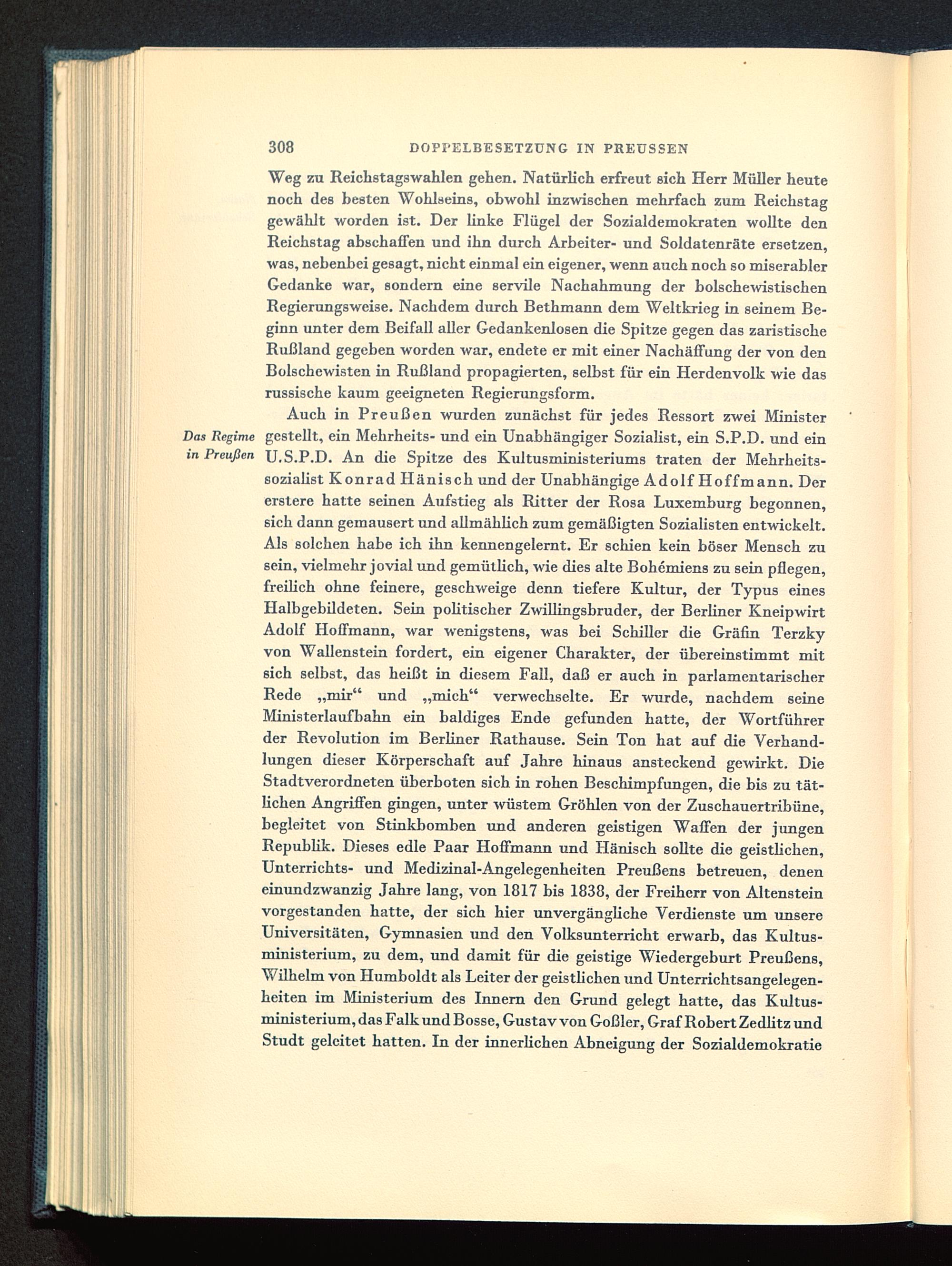 Auch in Preußen wurden zunächst für jedes Ressort zwei MinisterDas Regime gestellt, ein Mehrheits- und ein Unabhängiger Soziaüst, ein S.P.D. und einin Preußen U.S.P.D. An die Spitze des Kultusministeriums traten der Mehrheits-sozialist Konrad Hänisch und der Unabhängige Adolf Hoffmann . Dererstere hatte seinen Aufstieg als Ritter der Rosa Luxemburg begonnen,6ich dann gemausert und allmählich zum gemäßigten Sozialisten entwickelt.Als solchen habe ich ihn kennengelernt. Er schien kein böser Mensch zusein, vielmehr jovial und gemütlich, wie dies alte Bohemiens zu sein pflegen,freilich ohne feinere, geschweige denn tiefere Kultur, der Typus einesHalbgebildeten. Sein politischer Zwillingsbruder, der Berliner KneipwirtAdolf Hoffmann, war wenigstens, was bei Schiller die Gräfin Terzkyvon Wallenstein fordert, ein eigener Charakter, der übereinstimmt mitsich selbst, das heißt in diesem Fall, daß er auch in parlamentarischerRede „mir" und „mich" verwechselte. Er wurde, nachdem seineMinisterlaufbahn ein baldiges Ende gefunden hatte, der Wortführerder Revolution im Berliner Rathause. Sein Ton hat auf die Verhand-lungen dieser Körperschaft auf Jahre hinaus ansteckend gewirkt. DieStadtverordneten überboten sich in rohen Beschimpfungen, die bis zu tät-lichen Angriffen gingen, unter wüstem Gröhlen von der Zuschauertribüne,begleitet von Stinkbomben und anderen geistigen Waffen der jimgenRepublik. Dieses edle Paar Hoffmann und Hänisch sollte die geistlichen,Unterrichts- und Medizinal-Angelegenheiten Preußens betreuen, deneneinundzwanzig Jahre lang, von 1817 bis 1838, der Freiherr von Altensteinvorgestanden hatte, der sich hier unvergängliche Verdienste um unsereUniversitäten, Gymnasien und den Volksunterricht erwarb, das Kultus-ministerium, zu dem, und damit für die geistige Wiedergeburt Preußens,Wilhelm von Humboldt als Leiter der geistlichen und Unterrichtsangelegen-heiten im Ministerium des Innern den Grund gelegt hatte, das Kultus-ministerium, das Falk und Bosse, Gustav von Goßler, Graf Robert Zedlitz undStudt geleitet hatten. In der innerlichen Abneigung der Sozialdemokratie