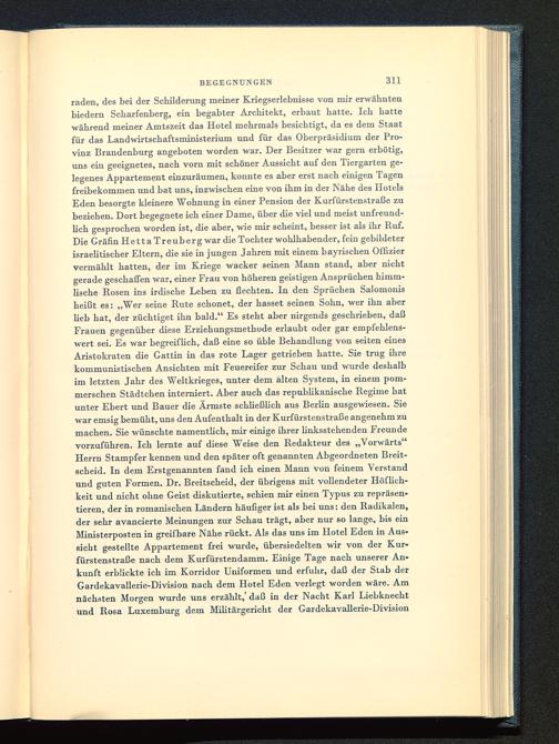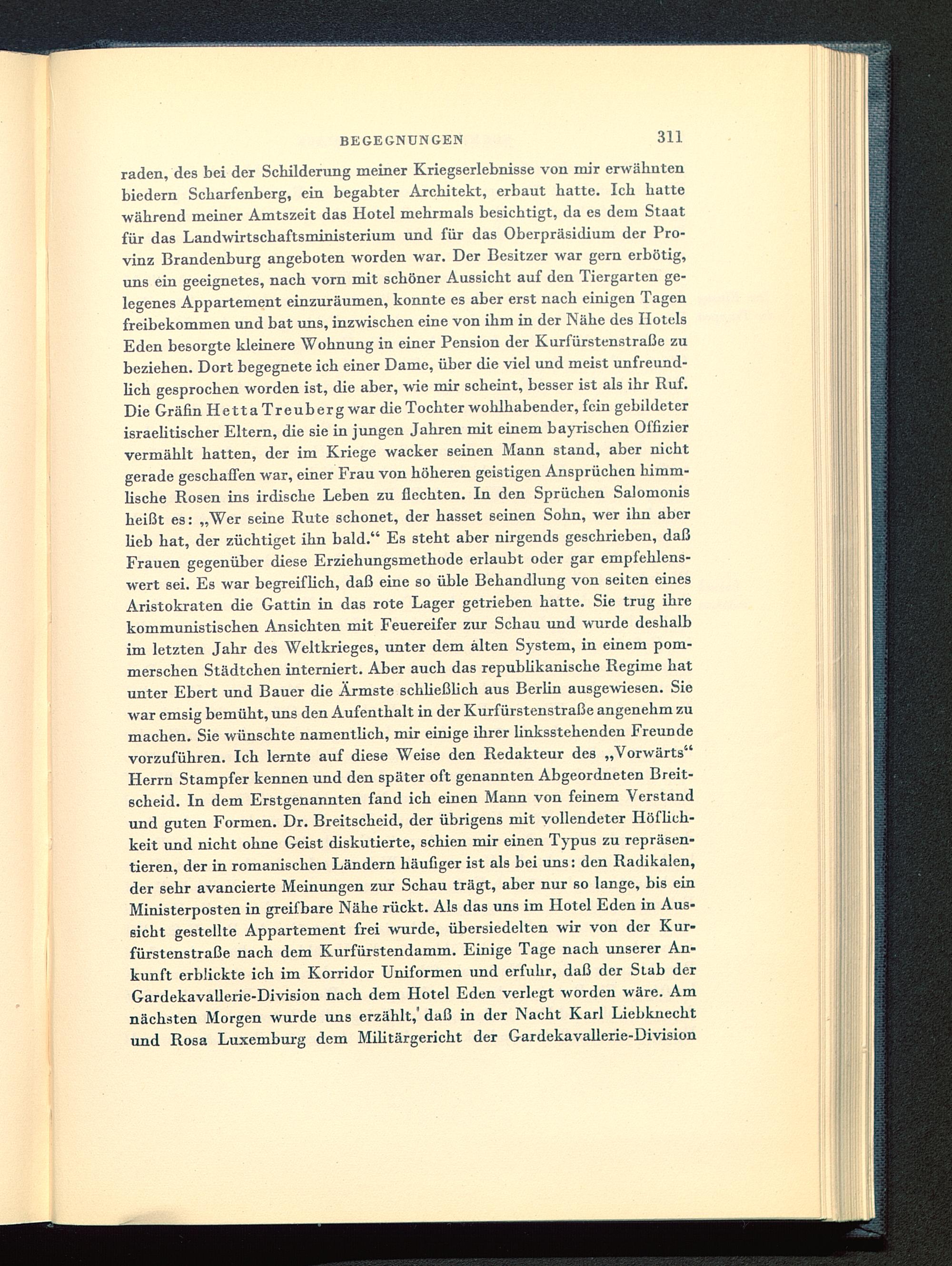 raden, des bei der Schilderung meiner Kriegserlebnisse von mir erwähntenbiedern Scharfenberg, ein begabter Architekt, erbaut hatte. Ich hattewährend meiner Amtszeit das Hotel mehrmals besichtigt, da es dem Staatfür das Landwirtschaftsrninisterium und für das Oberpräsidium der Pro-vinz Brandenburg angeboten worden war. Der Besitzer war gern erbötig,uns ein geeignetes, nach vorn mit schöner Aussicht auf den Tiergarten ge-legenes Appartement einzuräumen, konnte es aber erst nach einigen Tagenfreibekommen und bat uns, inzwischen eine von ihm in der Nähe des HotelsEden besorgte kleinere Wohnung in einer Pension der Kurfürstenstraße zubeziehen. Dort begegnete ich einer Dame, über die viel und meist unfreund-lich gesprochen worden ist, die aber, wie mir scheint, besser ist als ihr Ruf.Die Gräfin HettaTreuberg war die Tochter wohlhabender, fein gebildeterisraelitischer Eltern, die sie in jungen Jahren mit einem bayrischen Offiziervermählt hatten, der im Kriege wacker seinen Mann stand, aber nichtgerade geschaffen war, einer Frau von höheren geistigen Ansprüchen himm-lische Rosen ins irdische Leben zu flechten. In den Sprüchen Salomonisheißt es: „Wer seine Rute schonet, der hasset seinen Sohn, wer ihn aberlieb hat, der züchtiget ihn bald." Es steht aber nirgends geschrieben, daßFrauen gegenüber diese Erziehungsmethode erlaubt oder gar empfehlens-wert sei. Es war begreiflich, daß eine so üble Behandlung von Seiten einesAristokraten die Gattin in das rote Lager getrieben hatte. Sie trug ihrekommunistischen Ansichten mit Feuereifer zur Schau und wurde deshalbim letzten Jahr des Weltkrieges, unter dem alten System, in einem pom-merschen Städtchen interniert. Aber auch das republikanische Regime hatunter Ebert und Bauer die Ärmste schließlich aus Berlin ausgewiesen. Siewar emsig bemüht, uns den Aufenthalt in der Kurf iirstenstraße angenehm zumachen. Sie wünschte namentlich, mir einige ihrer linksstehenden Freundevorzuführen. Ich lernte auf diese Weise den Redakteur des „Vorwärts"Herrn Stampfer kennen und den später oft genannten Abgeordneten Breit-scheid. In dem Erstgenannten fand ich einen Mann von feinem Verstandund guten Formen. Dr. Breitscheid, der übrigens mit vollendeter Höflich-keit und nicht ohne Geist diskutierte, schien mir einen Typus zu repräsen-tieren, der in romanischen Ländern häufiger ist als bei uns: den Radikalen,der sehr avancierte Meinungen zur Schau trägt, aber nur so lange, bis einMinisterposten in greifbare Nähe rückt. Als das uns im Hotel Eden in Aus-sicht gestellte Appartement frei wurde, übersiedelten wir von der Kur-fürstenstraße nach dem Kurfürstendamm . Einige Tage nach unserer An-kunft erblickte ich im Korridor Uniformen und erfuhr, daß der Stab derGardekavallerie-Division nach dem Hotel Eden verlegt worden wäre. Amnächsten Morgen wurde uns erzählt,' daß in der Nacht Karl Liebknecht und Rosa Luxemburg dem Militärgericht der Gardekavallerie-Division