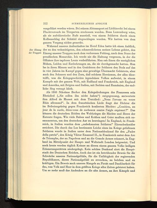Während unseres Aufenthaltes im Hotel Eden hatte ich einen Anblick,Der Einzug der zu den wehmütigsten, den schmerzlichsten meines Lebens gehört, dender Truppen Einzug unserer Truppen nach dem verlorenen Feldzug, nach dem Sturz derpreußischen Monarchie. Ich werde nie die Haltung vergessen, in der dieOffiziere ihre tapferen Leute vorbeiführten. Man sah ihnen die unsäglichenMühen, Leiden und Entbehrungen an, die sie durchgemacht hatten. Manlas in ihren Mienen und in den Gesichtern der Soldaten den Stolz auf dasin vier Jahren im Kampf gegen eine gewaltige Übermacht Geleistete, aberauch den Schmerz und den Zorn, daß solchem Heroismus, der alles über-trifft, was die Kriegsgeschichte irgendeines Volkes aufweist, in einemKampfe mit der ganzen Welt, mit Rußland und Frankreich, mit England und Amerika, mit Belgien und Italien, mit Serbien und Rumänien , der end-liche Sieg versagt bbeb.