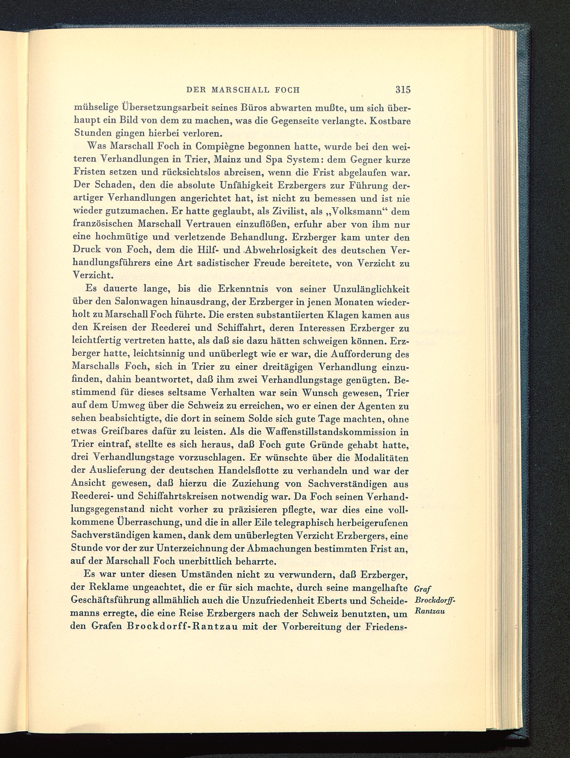 Was Marschall Foch in Compiegne begonnen hatte, wurde bei den wei-teren Verhandlungen in Trier, Mainz und Spa System: dem Gegner kurzeFristen setzen und rücksichtslos abreisen, wenn die Frist abgelaufen war.Der Schaden, den die absolute Unfähigkeit Erzbergers zur Führung der-artiger Verhandlungen angerichtet hat, ist nicht zu bemessen und ist niewieder gutzumachen. Er hatte geglaubt, als Zivilist, als „Volksmann" demfranzösischen Marschall Vertrauen einzuflößen, erfuhr aber von ihm nureine hochmütige und verletzende Behandlung. Erzberger kam unter denDruck von Foch, dem die Hilf- und Abwehrlosigkeit des deutschen Ver-handlungsführers eine Art sadistischer Freude bereitete, von Verzicht zuVerzicht.