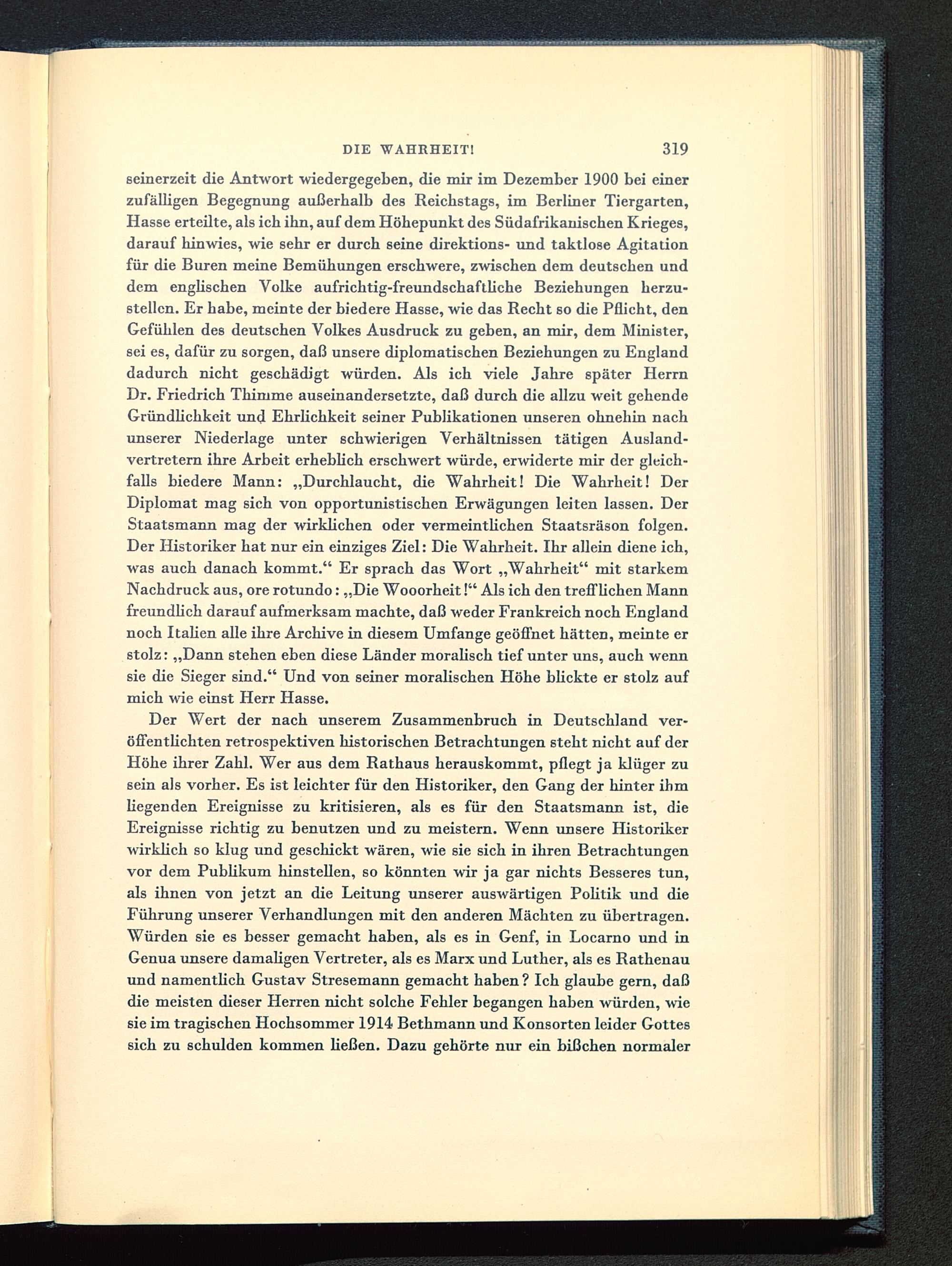 seinerzeit die Antwort wiedergegeben, die mir im Dezember 1900 bei einerzufälligen Begegnung außerhalb des Reichstags, im Berliner Tiergarten,Hasse erteilte, als ich ihn, auf dem Höhepunkt des Südafrikanischen Krieges,darauf hinwies, wie sehr er durch seine direktions- und taktlose Agitationfür die Buren meine Bemühungen erschwere, zwischen dem deutschen unddem englischen Volke aufrichtig-freundschaftliche Beziehungen herzu-stellen. Er habe, meinte der biedere Hasse, wie das Recht so die Pflicht, denGefühlen des deutschen Volkes Ausdruck zu geben, an mir, dem Minister,sei es, dafür zu sorgen, daß unsere diplomatischen Beziehungen zu England dadurch nicht geschädigt würden. Als ich viele Jahre später HerrnDr. Friedrich Thimme auseinandersetzte, daß durch die allzu weit gehendeGründlichkeit und Ehrlichkeit seiner Publikationen unseren ohnehin nachunserer Niederlage unter schwierigen Verhältnissen tätigen Ausland-vertretern ihre Arbeit erheblich erschwert würde, erwiderte mir der gleich-falls biedere Mann: „Durchlaucht, die Wahrheit! Die Wahrheit! DerDiplomat mag sich von opportunistischen Erwägungen leiten lassen. DerStaatsmann mag der wirklicken oder vermeintlichen Staatsräson folgen.Der Historiker hat nur ein einziges Ziel: Die Wahrheit. Ihr allein diene ich,was auch danach kommt." Er sprach das Wort „Wahrheit" mit starkemNachdruck aus, ore rotundo: „Die Wooorheit!" Als ich den trefflichen Mannfreundlich darauf aufmerksam machte, daß weder Frankreich noch England noch Italien alle ihre Archive in diesem Umfange geöffnet hätten, meinte erstolz: „Dann stehen eben diese Länder moralisch tief unter uns, auch wennsie die Sieger sind." Und von seiner moralischen Höhe bückte er stolz aufmich wie einst Herr Hasse.