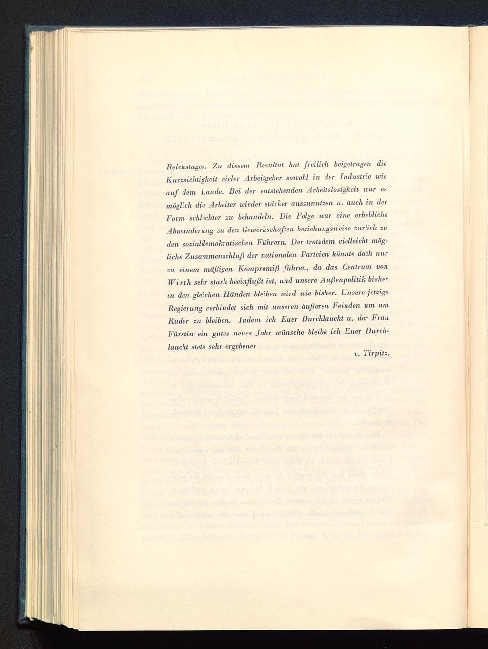 Reichstages. Zu diesem Resultat hat freilich beigetragen dieKurzsichtigkeit vieler Arbeitgeber sowohl in der Industrie wieauf dem Lande. Bei der entstehenden Arbeitslosigkeit war esmöglich die Arbeiter wieder stärker auszunutzen u. auch in derForm schlechter zu behandeln. Die Folge, war eine erheblicheAbwanderung zu den Gewerkschaften beziehungsiveise zurück zuden sozialdemokratischen Führern. Der trotzdem vielleicht mög-liche Zusammenschluß der nationalen Parteien könnte doch nurzu einem mäßigen Kompromiß führen, da das Centrum vonWirth sehr stark beeinflußt ist, und unsere Außenpolitik bisherin den gleicheji Händen bleiben wird wie bisher. Unsere jetzigeRegierung verbindet sich mit unseren äußeren Feinden um amRuder zu bleiben. Indem ich Euer Durchlaucht u. der FrauFürstin ein gutes neues Jahr wünsche bleibe ich Euer Durch-laucht stets sehr ergebener