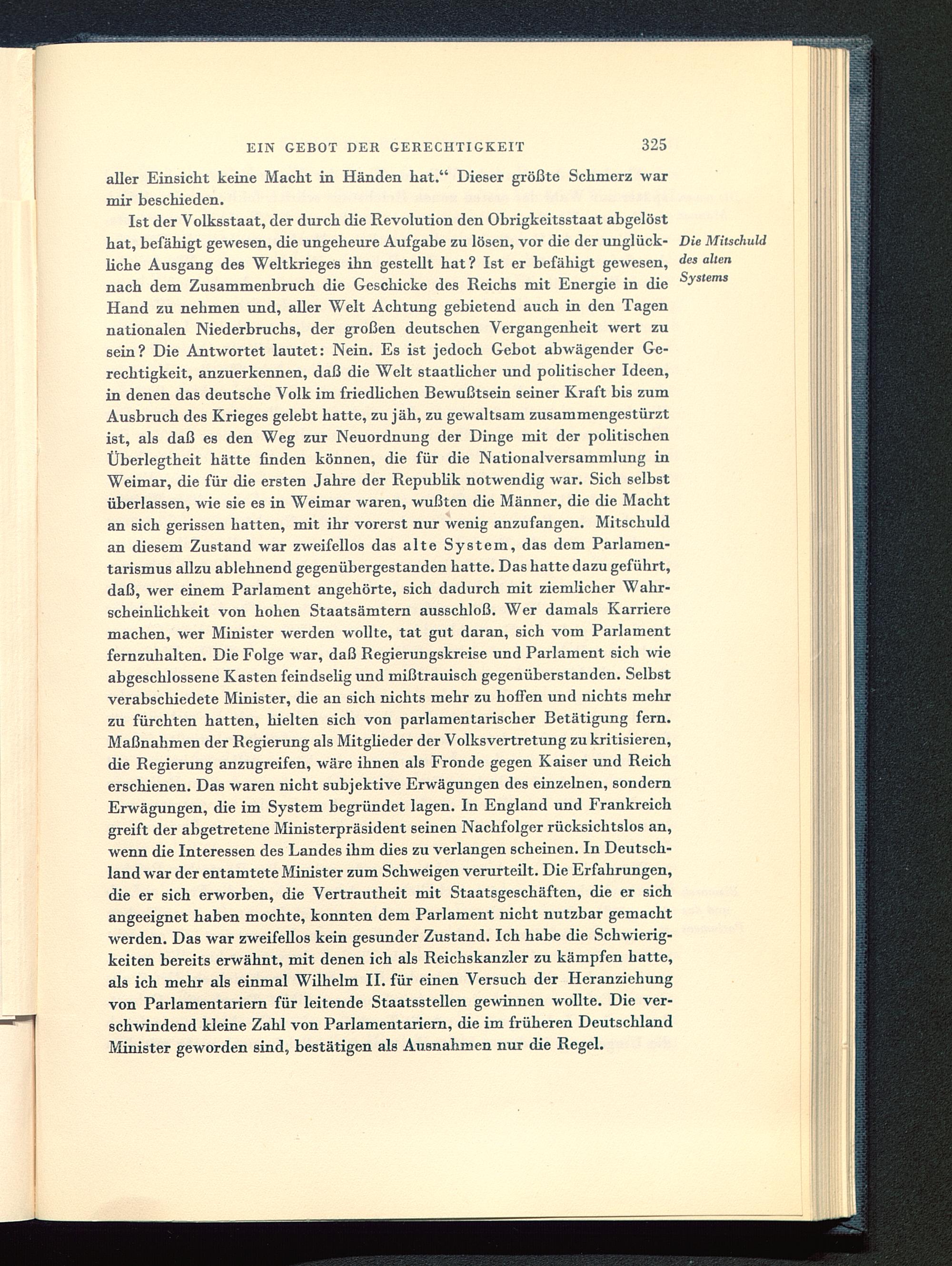 Ist der Volksstaat, der durch die Revolution den Obrigkeitsstaat abgelösthat, befähigt gewesen, die ungeheure Aufgabe zu lösen, vor die der Unglück- Die Mitschuldliehe Ausgang des Weltkrieges ihn gestellt hat ? Ist er befähigt gewesen, ^ es a ^ tennach dem Zusammenbruch die Geschicke des Reichs mit Energie in die Sy $temsHand zu nehmen und, aller Welt Achtung gebietend auch in den Tagennationalen Niederbruchs, der großen deutschen Vergangenheit wert zusein? Die Antwortet lautet: Nein. Es ist jedoch Gebot abwägender Ge-rechtigkeit, anzuerkennen, daß die Welt staatlicher und politischer Ideen,in denen das deutsche Volk im friedlichen Bewußtsein seiner Kraft bis zumAusbruch des Krieges gelebt hatte, zu jäh, zu gewaltsam zusammengestürztist, als daß es den Weg zur Neuordnung der Dinge mit der politischenUberlegtheit hätte finden können, die für die Nationalversammlung inWeimar, die für die ersten Jahre der Republik notwendig war. Sich selbstüberlassen, wie sie es in Weimar waren, wußten die Männer, die die Machtan sich gerissen hatten, mit ihr vorerst nur wenig anzufangen. Mitschuldan diesem Zustand war zweifellos das alte System, das dem Parlamen-tarismus allzu ablehnend gegenübergestanden hatte. Das hatte dazu geführt,daß, wer einem Parlament angehörte, sich dadurch mit ziemlicher Wahr-scheinlichkeit von hohen Staatsämtern ausschloß. Wer damals Karrieremachen, wer Minister werden wollte, tat gut daran, sich vom Parlamentfernzuhalten. Die Folge war, daß Regierungskrise und Parlament sich wieabgeschlossene Kasten feindselig und mißtrauisch gegenüberstanden. Selbstverabschiedete Minister, die an sich nichts mehr zu hoffen und nichts mehrzu fürchten hatten, hielten sich von parlamentarischer Betätigung fern.Maßnahmen der Regierung als Mitglieder der Volksvertretung zu kritisieren,die Regierung anzugreifen, wäre ihnen als Fronde gegen Kaiser und Reicherschienen. Das waren nicht subjektive Erwägungen des einzelnen, sondernErwägungen, die im System begründet lagen. In England und Frankreich greift der abgetretene Ministerpräsident seinen Nachfolger rücksichtslos an,wenn die Interessen des Landes ihm dies zu verlangen scheinen. In Deutsch-land war der entamtete Minister zum Schweigen verurteilt. Die Erfahrungen,die er sich erworben, die Vertrautheit mit Staatsgeschäften, die er sichangeeignet haben mochte, konnten dem Parlament nicht nutzbar gemachtwerden. Das war zweifellos kein gesunder Zustand. Ich habe die Schwierig-keiten bereits erwähnt, mit denen ich als Reichskanzler zu kämpfen hatte,als ich mehr als einmal Wilhelm II. für einen Versuch der Heranziehungvon Parlamentariern für leitende Staatsstellen gewinnen wollte. Die ver-schwindend kleine Zahl von Parlamentariern, die im früheren Deutschland Minister geworden sind, bestätigen als Ausnahmen nur die Regel.