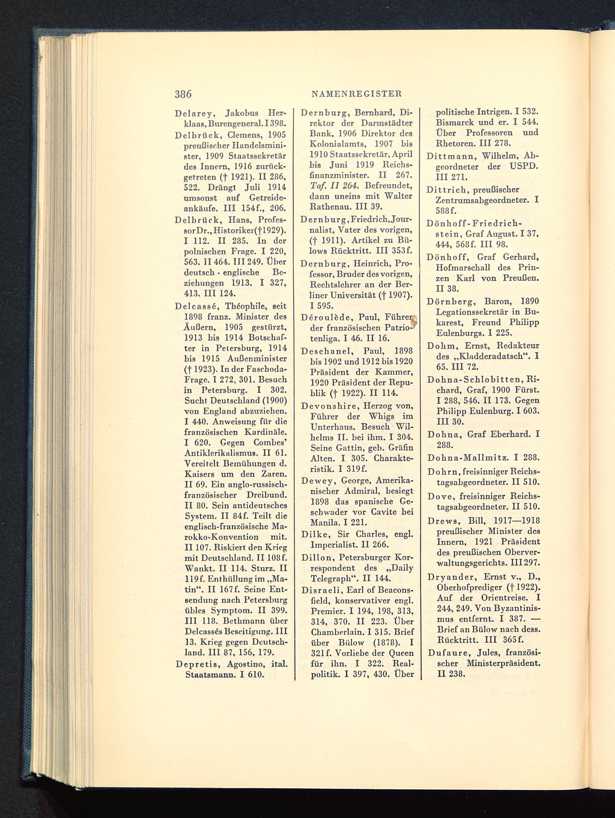 Delcasse, Theophile, seit1898 franz. Minister desÄußern, 1905 gestürzt,1913 bis 1914 Botschaf-ter in Petersburg , 1914bis 1915 Außenminister(t 1923). In der Faschoda-Frage. I 272, 301. Besuchin Petersburg . I 302.Sucht Deutschland (1900)von England abzuziehen.I 440. Anweisung für diefranzösischen Kardinäle.