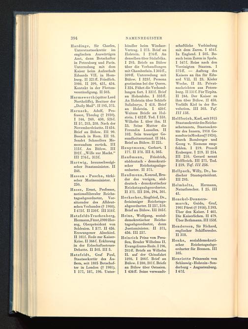 Hardinge, Sir Charles,Unterstaatssekretär imenglischen AuswärtigenAmt , dann Botschafterin Petersburg und Paris .Unterredung mit demKaiser beim AufenthaltEduards VII. in Hom-burg . II 321 ff. Friedlich.1908. II 399, 431, 434.Kontakt in der Flotten-verständigung. II 503.