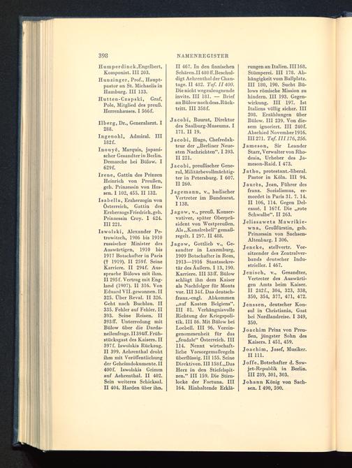 Iswolski, Alexander Pc-trowitsch, 1906 bis 1910russischer Minister desAuswärtigen, 1910 bis1917 Botschafter iu Paris (t 1919). II 259 f. SeineKarriere. II 294f. Aus-sprache Bülows mit ihm.II 295 f. Vertrag mit Eng-land (1907). II 316. VonEduard VII. gewonnen. II325. Uber Reval. II 326.Geht nach Buchlau. II335. Fehler auf Fehler. II393. Seine Reisen. II393 ff. Unterredung mitBülow über die Darda-nellenfrage. II 394ff. Früh-stücksgast des Kaisers. II397 f. Iswolskis Rückzug.II 399. Aehrenthal drohtihm mit Veröffentlichungder Geheimdokumente.il400 f. Iswolskis Grimmauf Aehrenthal. II 402.Sein weiteres Schicksal.II 404. Harden über ihn.
