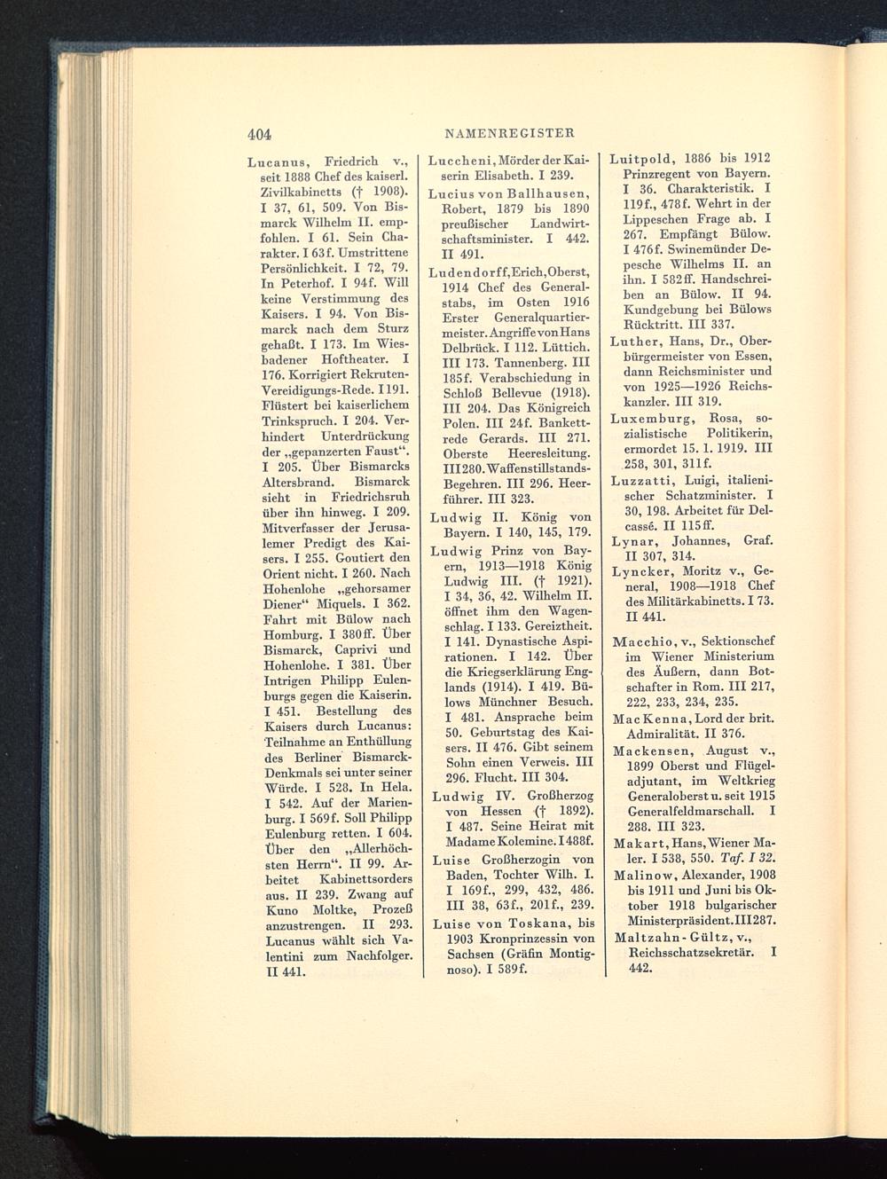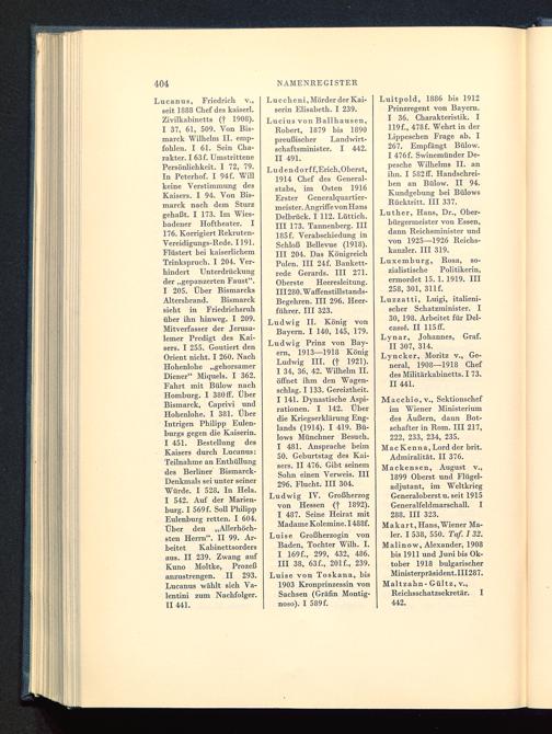 Ludwig Prinz von Bay-ern, 1913—1918 KönigLudwig III. (f 1921).I 34, 36, 42. Wilhelm II. öffnet ihm den Wagen-schlag. I 133. Gereiztheit.I 141. Dynastische Aspi-rationen. I 142. Überdie Kriegserklärung Eng-lands (1914). I 419. Bü-lows Münchner Besuch.I 481. Ansprache beim50. Geburtstag des Kai-sers. II 476. Gibt seinemSohn einen Verweis. III296. Flucht. III 304.