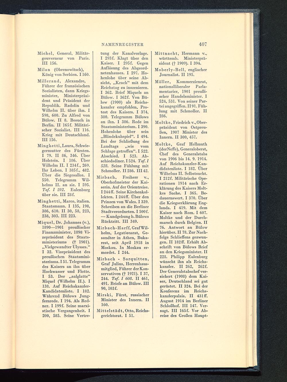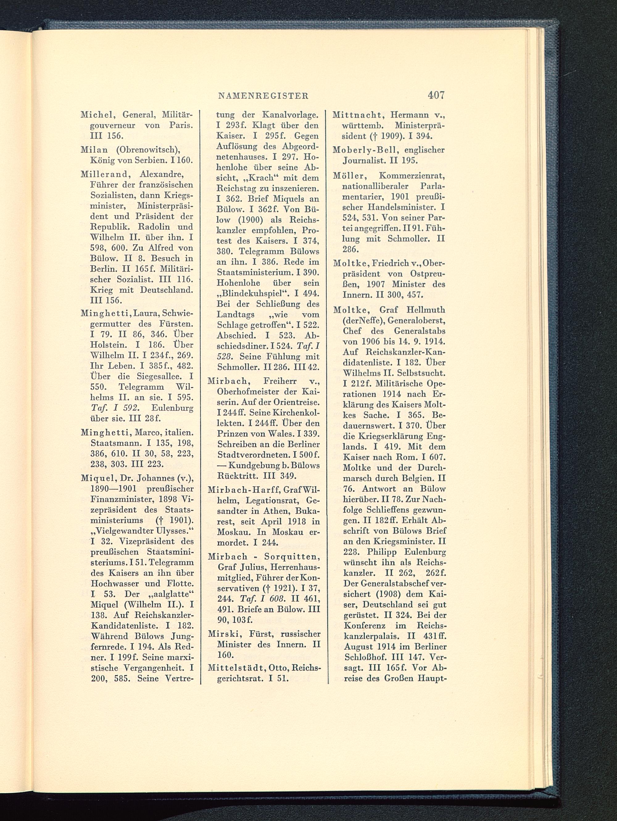 Minghetti,Laura, Schwie-germutter des Fürsten .I 79. II 86, 346. ÜberHolstein . I 186. ÜberWilhelm II. I 234 f., 269.Ihr Leben. I 385 f., 482.Über die Siegesallee . I550. Telegramm Wil-helms IL an sie. I 595.Taf. I 592. Eulenburgüber sie. III 28 f.