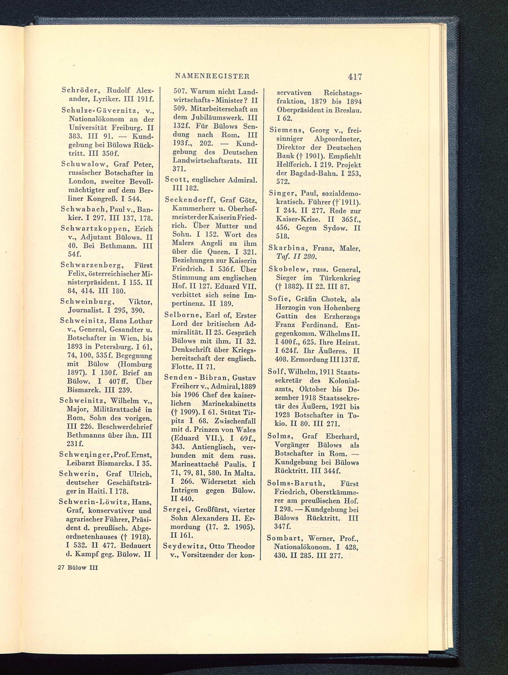 Schweinitz, Hans Lothar v., General, Gesandter u.Botschafter in Wien , bis1893 in Petersburg . I 61,74, 100, 535 f. Begegnungmit Bülow (Homburg1897). I 130f. Brief anBülow. I 407 fif. ÜberBismarck. III 239.