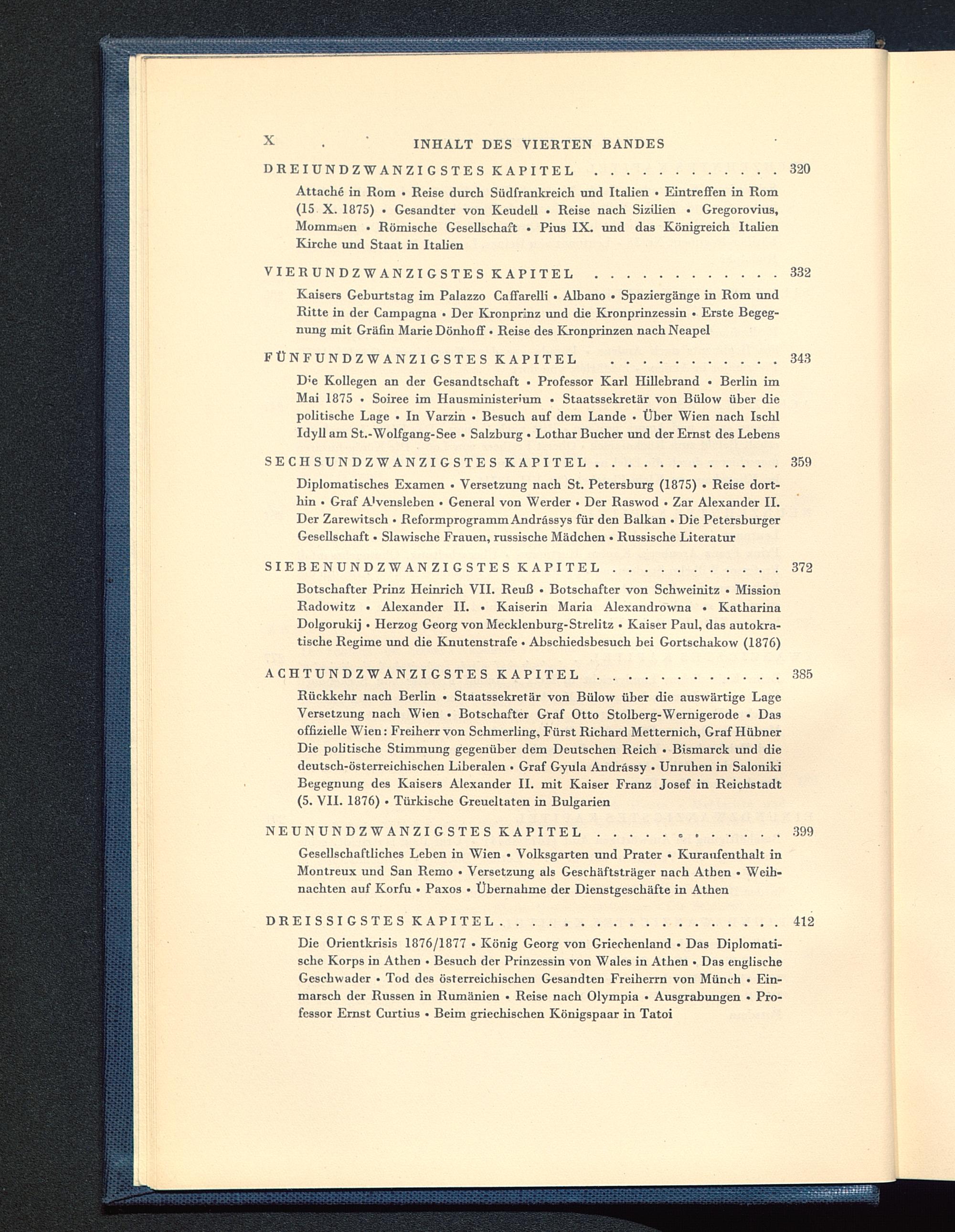 Diplomatisches Examen • Versetzung nach St. Petersburg (1875) • Reise dort-hin • Graf A'vensleben • General von Werder • Der Raswod . Zar Alexander II .Der Zarewitsch • Reformprogramm Andrässys für den Balkan • Die PetersburgerGesellschaft • Slawische Frauen, russische Mädchen • Russische Literatur
