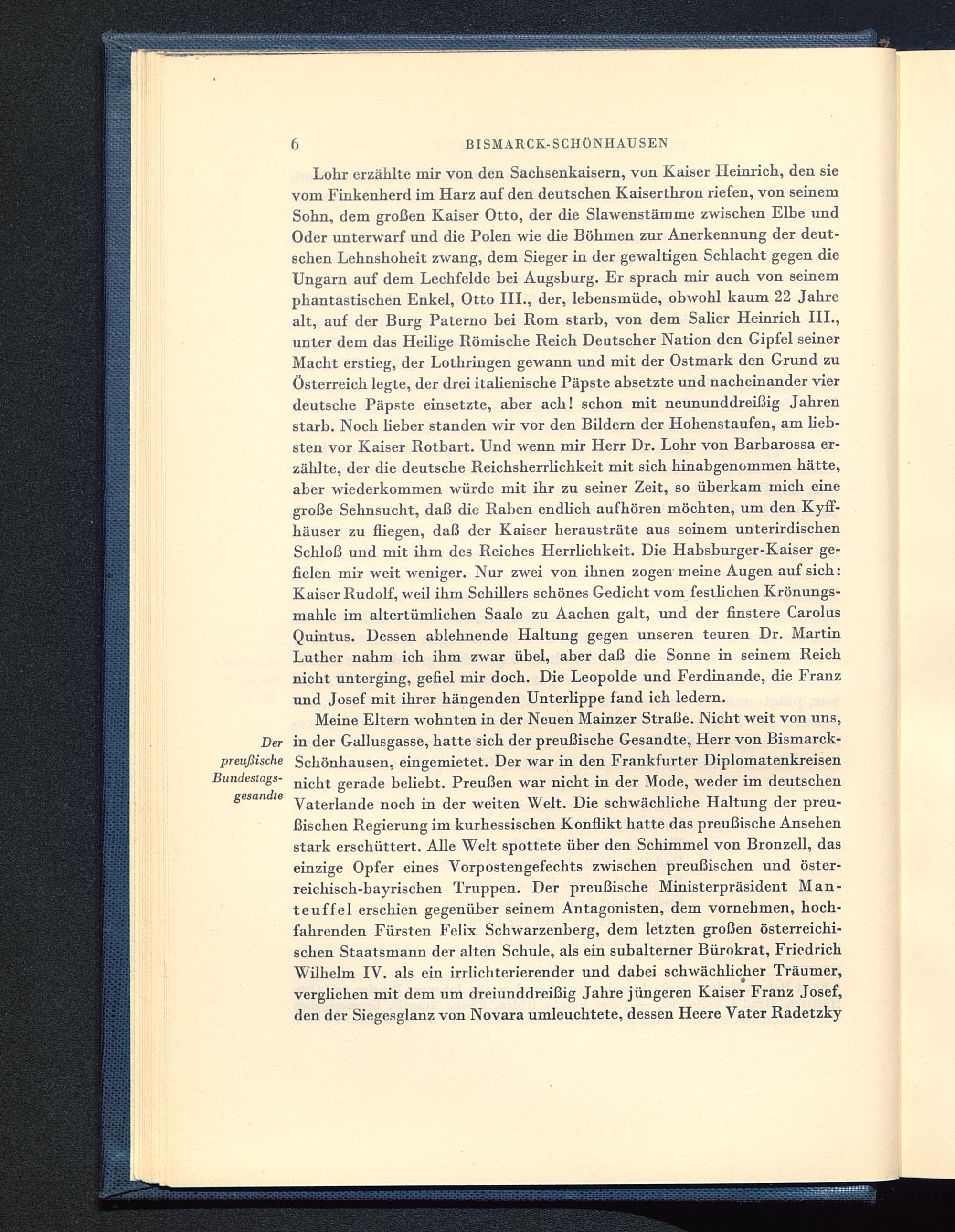 Meine Eltern wohnten in der Neuen Mainzer Straße. Nicht weit von uns,Der in der Gallusgasse, hatte sich der preußische Gesandte, Herr von Bismarck-preußische Schönhausen, eingemietet. Der war in den Frankfurter DiplomatenkreisenBundettags- n j cüt g Cra( ] e beliebt. Preußen war nicht in der Mode, weder im deutschen