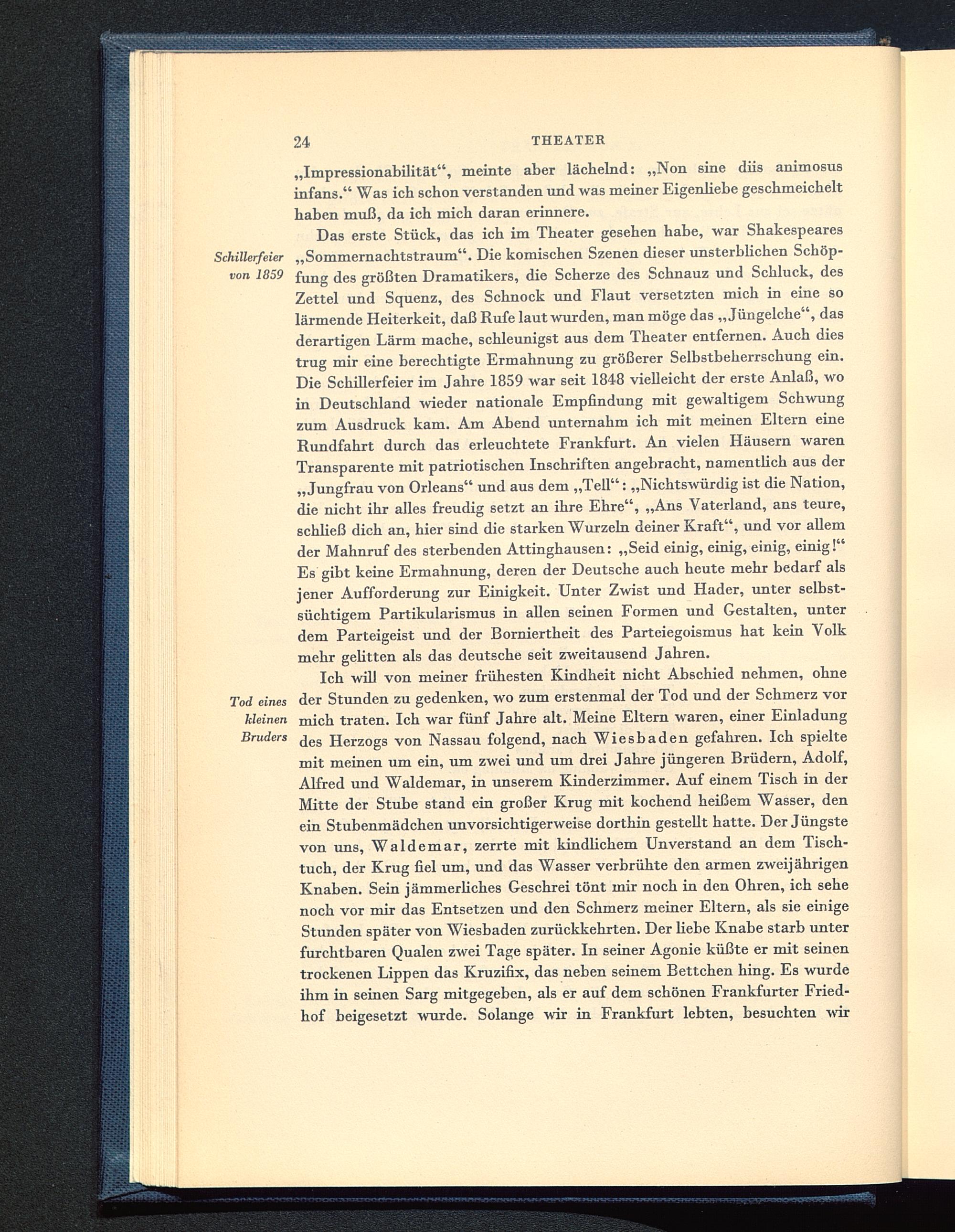 Ich will von meiner frühesten Kindheit nicht Abschied nehmen, ohneTod eines der Stunden zu gedenken, wo zum erstenmal der Tod und der Schmerz vorkleinen mich traten. Ich war fünf Jahre alt. Meine Eltern waren, einer EinladungBruders ^ es jj erz0 g S von Nassau folgend, nach Wiesbaden gefahren. Ich spieltemit meinen um ein, um zwei und um drei Jahre jüngeren Brüdern, Adolf,Alfred und Waldemar, in unserem Kinderzimmer. Auf einem Tisch in derMitte der Stube stand ein großer Krug mit kochend heißem Wasser, denein Stubenmädchen unvorsichtigerweise dorthin gestellt hatte. Der Jüngstevon uns, Waldemar, zerrte mit kindlichem Unverstand an dem Tisch-tuch, der Krug fiel um, und das Wasser verbrühte den armen zweijährigenKnaben. Sein jämmerliches Geschrei tönt mir noch in den Ohren, ich sehenoch vor mir das Entsetzen und den Schmerz meiner Eltern, als sie einigeStunden später von Wiesbaden zurückkehrten. Der hebe Knabe starb unterfurchtbaren Qualen zwei Tage später. In seiner Agonie küßte er mit seinentrockenen Lippen das Kruzifix, das neben seinem Bettchen hing. Es wurdeihm in seinen Sarg mitgegeben, als er auf dem schönen Frankfurter Fried-hof beigesetzt wurde. Solange wir in Frankfurt lebten, besuchten wir