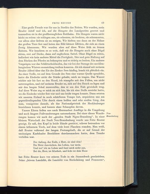 Unsere Eltern ließen uns nach Herzenslust Ausflüge in die Umgebungund auch längere Fußwanderungen unternehmen. Bei einer dieser Wände- Ncu-rungen kamen wir nach der „gauden Stadt Nigen-Bramborg". In einer Brandenburgkleinen Wirtschaft der Stadt Neu-Brandenburg wurde uns Fritz Reuter gezeigt. Er saß, den Kopf in beide Hände gestützt, schwer betrunken voreinem hölzernen Tisch, auf dem viele leere Flaschen standen. Man weiß,daß Reuter während der langen Festungshaft, die er auf Grund derunsinnigen Karlsbader Beschlüsse durchzumachen hatte, dem Trünkeverfallen war.