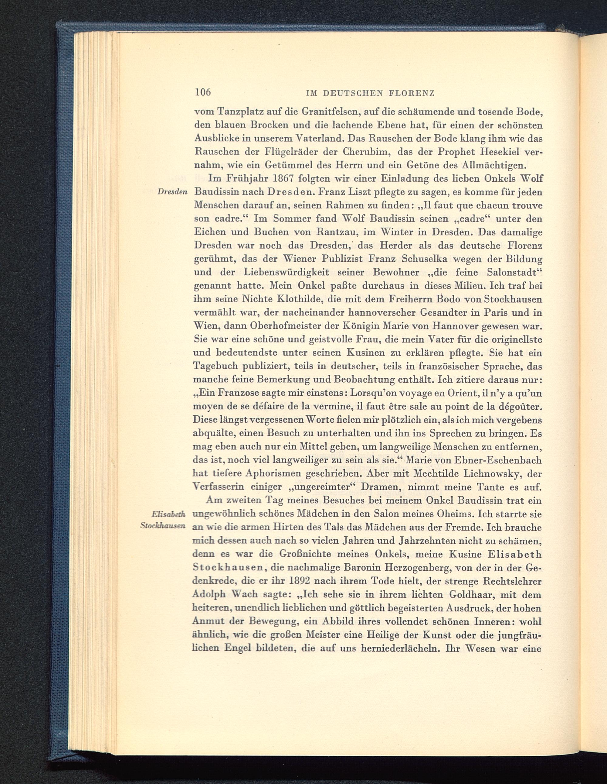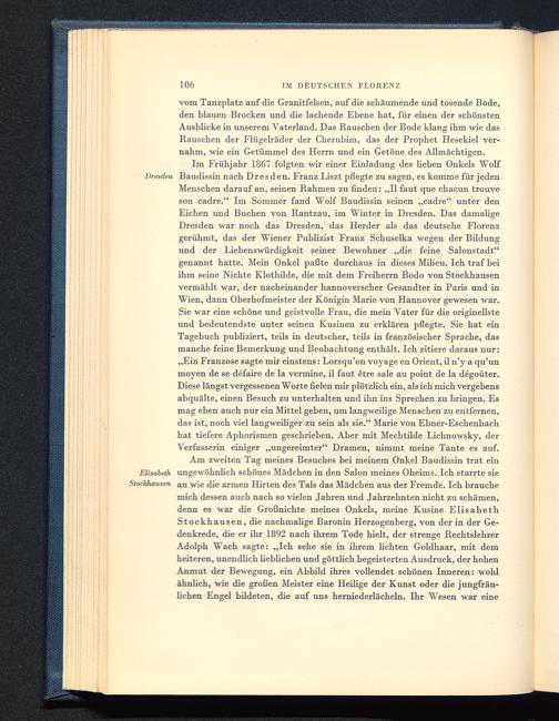 vom Tanzplatz auf die Granitfelsen, auf die schäumende und tosende Bode,den blauen Brocken und die lachende Ebene hat, für einen der schönstenAusbücke in unserem Vaterland. Das Rauschen der Bode klang ihm wie dasRauschen der Flügelräder der Cherubim, das der Prophet Hesekiel ver-nahm, wie ein Getümmel des Herrn und ein Getöne des Allmächtigen.Im Frühjahr 1867 folgten wir einer Einladung des heben Onkels WolfDresden Baudissin nach Dresden. Franz Liszt pflegte zu sagen, es komme für jedenMenschen darauf an, seinen Rahmen zu finden: „II faut que chacun trouveson cadre." Im Sommer fand Wolf Baudissin seinen „cadre" unter denEichen und Buchen von Rantzau, im Winter in Dresden . Das damaligeDresden war noch das Dresden, das Herder als das deutsche Florenz gerühmt, das der Wiener Publizist Franz Schuselka wegen der Bildungund der Liebenswürdigkeit seiner Bewohner „die feine Salonstadt"genannt hatte. Mein Onkel paßte durchaus in dieses Milieu. Ich traf beiihm seine Nichte Klothilde, die mit dem Freiherrn Bodo von Stockhausenvermählt war, der nacheinander hannoverscher Gesandter in Paris und inWien , dann Oberhofmeister der Königin Marie von Hannover gewesen war.Sie war eine schöne und geistvolle Frau, die mein Vater für die originellsteund bedeutendste unter seinen Kusinen zu erklären pflegte. Sie hat einTagebuch publiziert, teils in deutscher, teils in französischer Sprache, dasmanche feine Bemerkung und Beobachtung enthält. Ich zitiere daraus nur:„Ein Franzose sagte mir einstens: Lorsqu'on voyage en Orient, il n'y a qu'unmoyen de se defaire de la vermine, il faut etre sale au point de la degoüter.Diese längst vergessenen Worte fielen mir plötzlich ein, als ich mich vergebensabquälte, einen Besuch zu unterhalten und ihn ins Sprechen zu bringen. Esmag eben auch nur ein Mittel geben, um langweilige Menschen zu entfernen,das ist, noch viel langweiliger zu sein als sie." Marie von Ebner-Eschenbach hat tiefere Aphorismen geschrieben. Aber mit Mechtilde Lichnowsky , derVerfasserin einiger „ungereimter" Dramen, nimmt meine Tante es auf.Am zweiten Tag meines Besuches bei meinem Onkel Baudissin trat einElisabeth ungewöhnlich schönes Mädchen in den Salon meines Oheims. Ich starrte sieStockhausen an wie die armen Hirten des Tals das Mädchen aus der Fremde. Ich brauchemich dessen auch nach so vielen Jahren und Jahrzehnten nicht zu schämen,denn es war die Großnichte meines Onkels, meine Kusine ElisabethStockhausen, die nachmalige Baronin Herzogenberg , von der in der Ge-denkrede, die er ihr 1892 nach ihrem Tode hielt, der strenge RechtslehrerAdolph Wach sagte: „Ich sehe sie in ihrem lichten Goldhaar, mit demheiteren, unendlich lieblichen und göttlich begeisterten Ausdruck, der hohenAnmut der Bewegung, ein Abbild ihres vollendet schönen Inneren: wohlähnlich, wie die großen Meister eine Heilige der Kunst oder die jungfräu-lichen Engel bildeten, die auf uns herniederlächeln. Ihr Wesen war eine