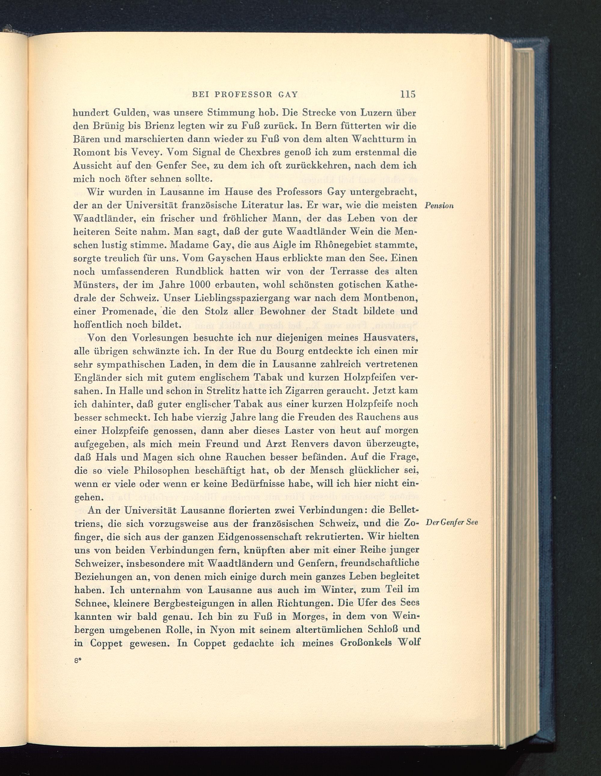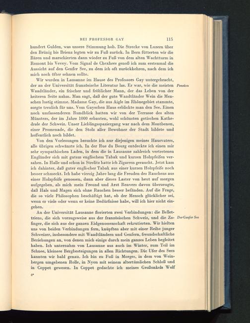 Von den Vorlesungen besuchte ich nur diejenigen meines Hausvaters,alle übrigen schwänzte ich. In der Bue du Bourg entdeckte ich einen mirsehr sympathischen Laden, in dem die in Lausanne zahlreich vertretenenEngländer sich mit gutem englischem Tabak und kurzen Holzpfeifen ver-sahen. In Halle und schon in Strelitz hatte ich Zigarren geraucht. Jetzt kamich dahinter, daß guter englischer Tabak aus einer kurzen Holzpfeife nochbesser schmeckt. Ich habe vierzig Jahre lang die Freuden des Bauchens auseiner Holzpfeife genossen, dann aber dieses Laster von heut auf morgenaufgegeben, als mich mein Freund und Arzt Benvers davon überzeugte,daß Hals und Magen sich ohne Bauchen besser befänden. Auf die Frage,die so viele Philosophen beschäftigt hat, ob der Mensch glücklicher sei,wenn er viele oder wenn er keine Bedürfnisse habe, will ich hier nicht ein-gehen.