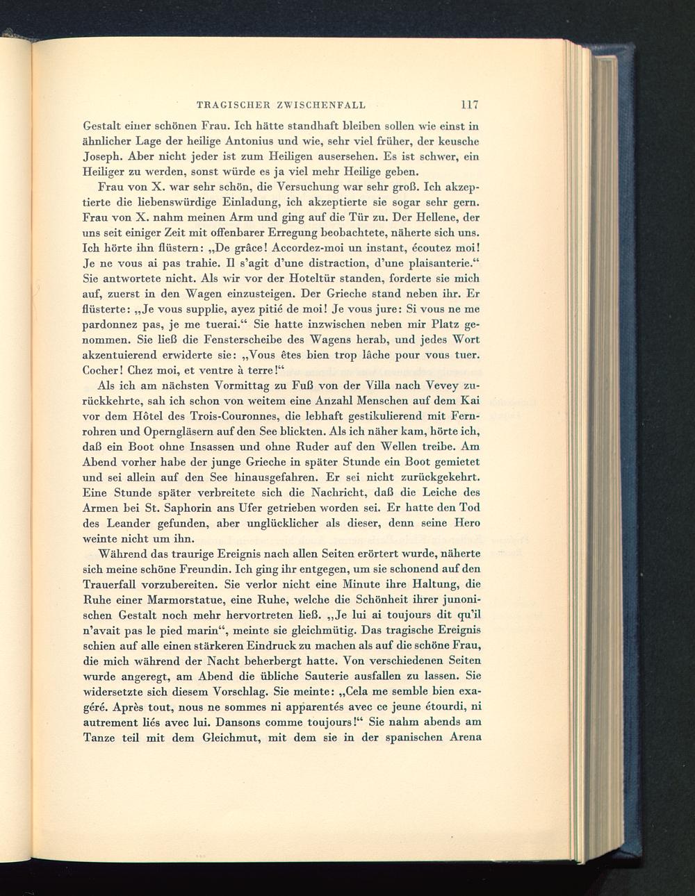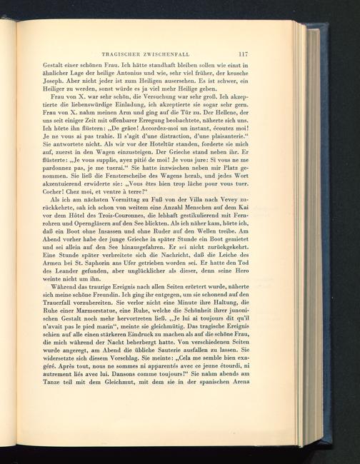 Frau von X. war sehr schön, die Versuchung war sehr groß. Ich akzep-tierte die Hebenswürdige Einladung, ich akzeptierte sie sogar sehr gern.Frau von X. nahm meinen Arm und ging auf die Tür zu. Der Hellene, deruns seit einiger Zeit mit offenbarer Erregung beobachtete, näherte sich uns.Ich hörte ihn flüstern: „De gräce! Accordez-moi un instant, ecoutez moi!Je ne vous ai pas trahie. II s'agit d'une distraction, d'une plaisanterie."Sie antwortete nicht. Als wir vor der Hoteltür standen, forderte sie michauf, zuerst in den Wagen einzusteigen. Der Grieche stand neben ihr. Erflüsterte: „Je vous supplie, ayez pitie de moi! Je vous jure: Si vous ne mepardonnez pas, je me tuerai." Sie hatte inzwischen neben mir Platz ge-nommen. Sie Heß die Fensterscheibe des Wagens herab, und jedes Wortakzentuierend erwiderte sie: „Vous etes bien trop lache pour vous tuer.Cocher! Chez moi, et ventre ä terre!"